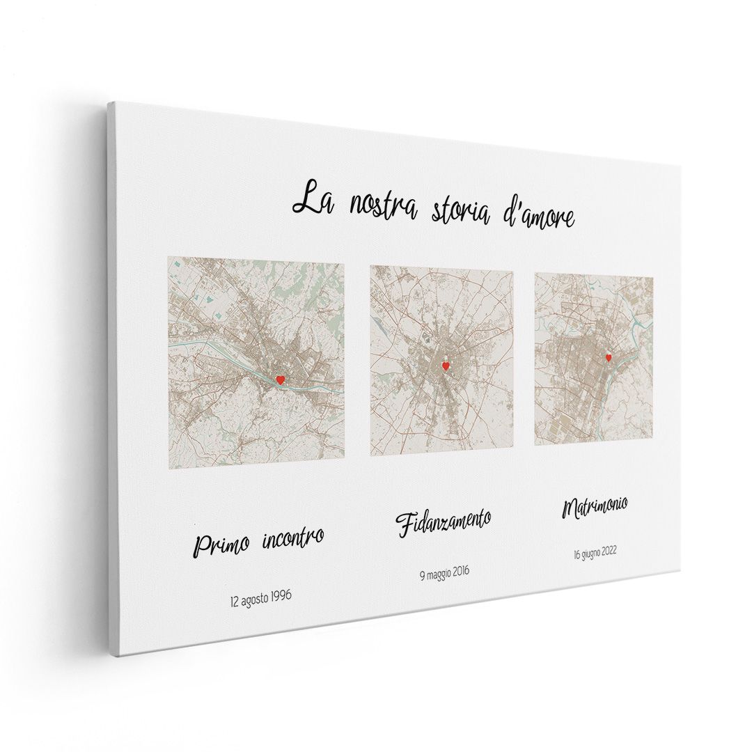 Cercate un regalo unico e significativo per un matrimonio? La nostra Mappa Tela Incontrati Fidanzati Sposati è la scelta perfetta. Questa tela personalizzata presenta tre mappe, ognuna evidenziando un traguardo significativo nella relazione della coppia: dove si sono incontrati, si sono fidanzati e si sono sposati.