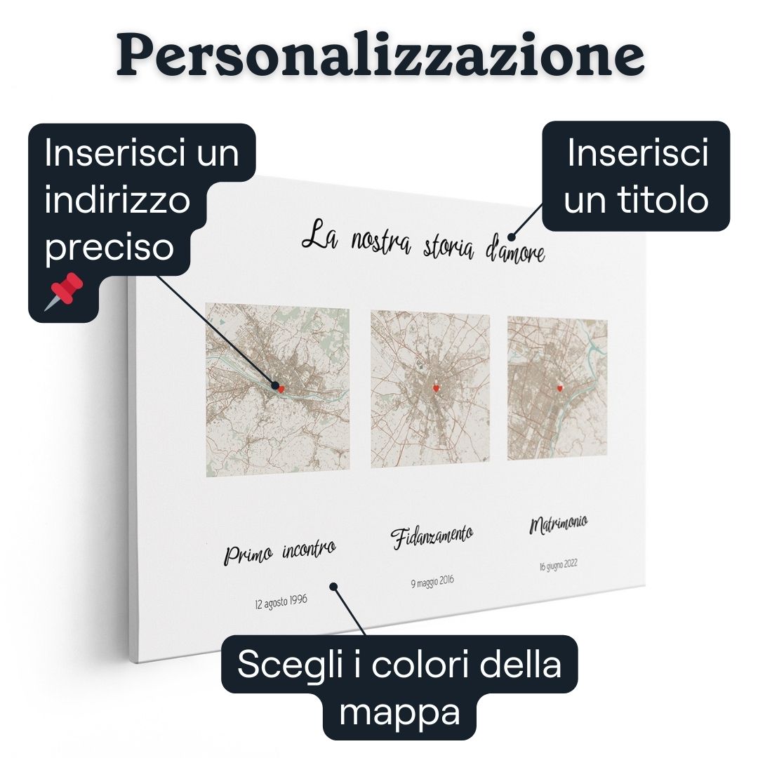 - Celebra tre traguardi della tua relazione con una mappa personalizzata, un ricordo unico e sentimentale da custodire