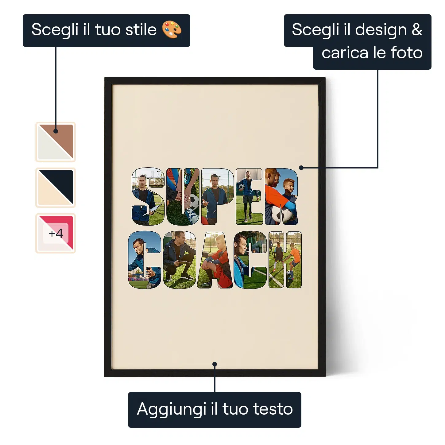 Trasforma le foto del team e i momenti memorabili vissuti in un collage artistico personalizzato che celebra la leadership di un allenatore e diventa un ricordo pieno di gratitudine