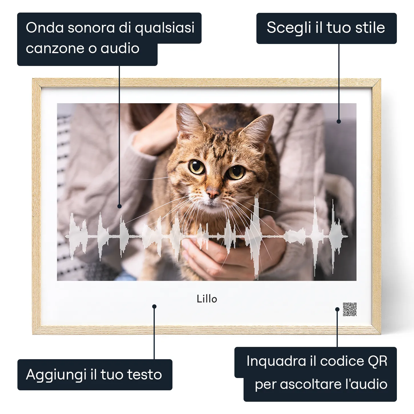 Trasforma il miagolio o il suono delle fusa del tuo gatto in una straordinaria opera d'arte personalizzata che catturi il suo verso unico