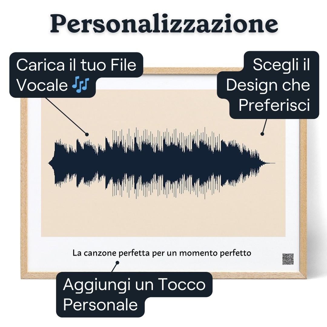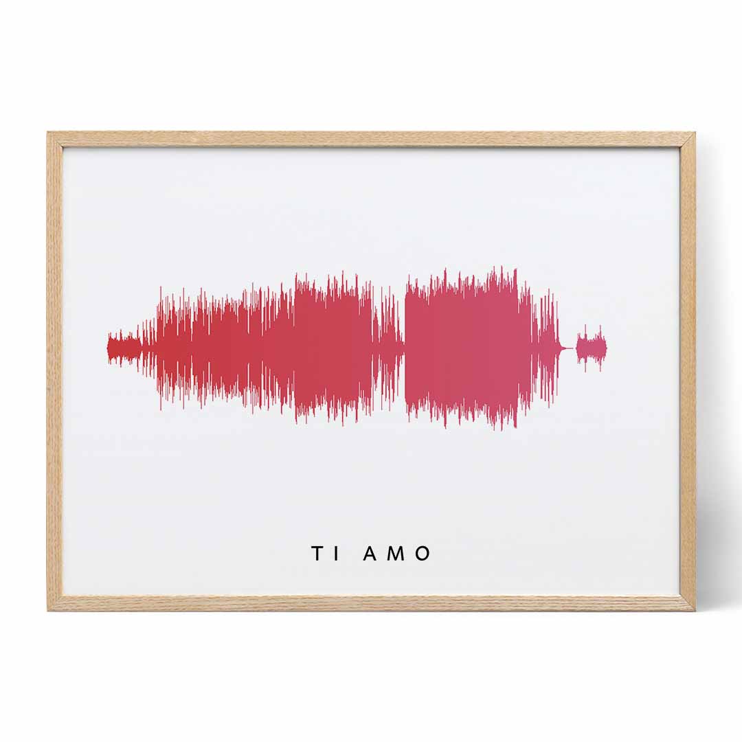 Ciò che rende un’Onda Sonora del Ti Amo ancora più speciale è la possibilità di personalizzarla secondo i gusti di chi la riceve. Ogni onda sonora è creata in base alla voce che fornisci, e per questo motivo non è paragonabile a un semplice quadro che trovi in un negozio qualsiasi. Quando appendi la tua stampa alle pareti, sai per certo che nessun altro ne ha un’altra uguale alla tua.