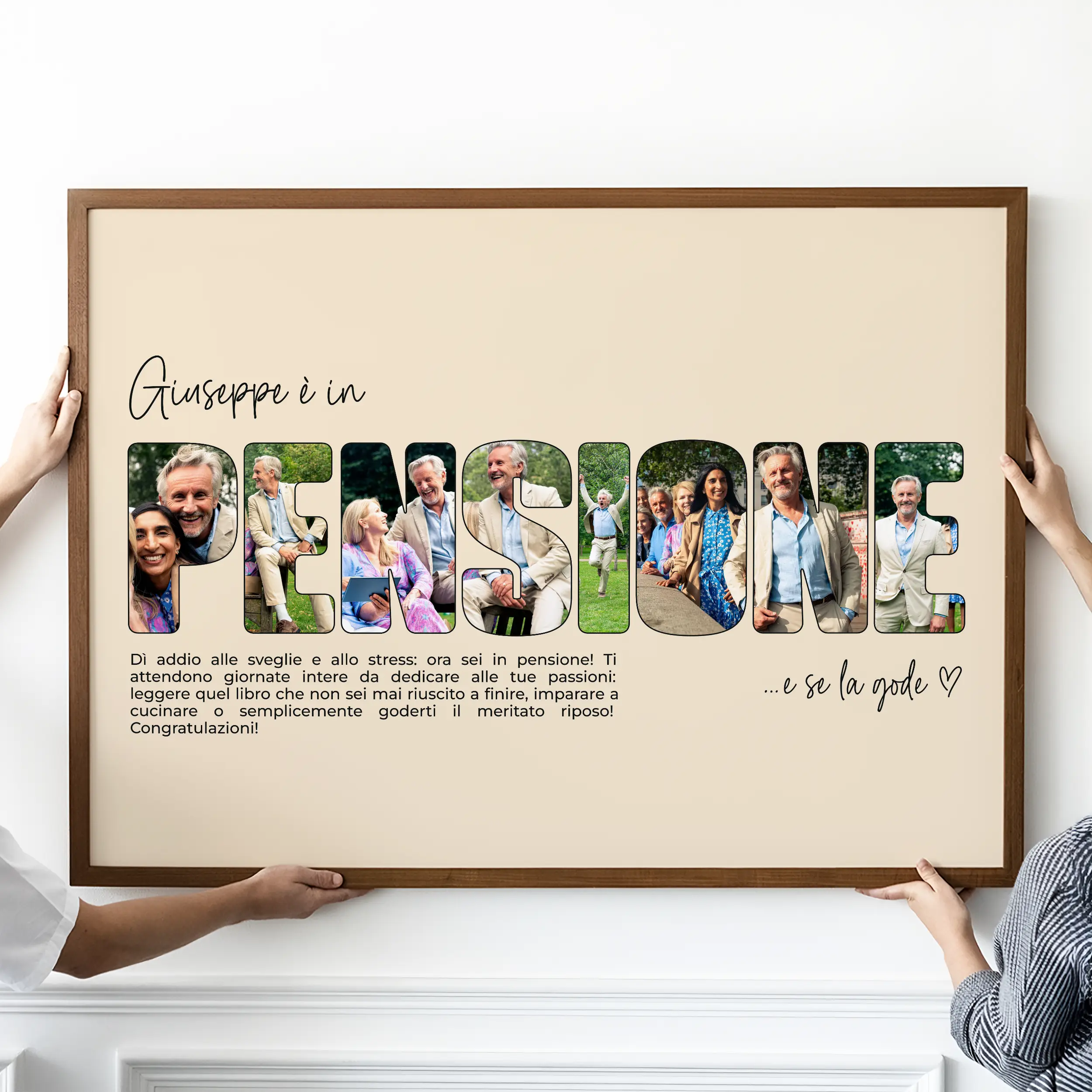 Un collage fotografico personalizzato per celebrare la meritata pensione, un regalo pieno di ricordi che renderanno speciale questo viaggio