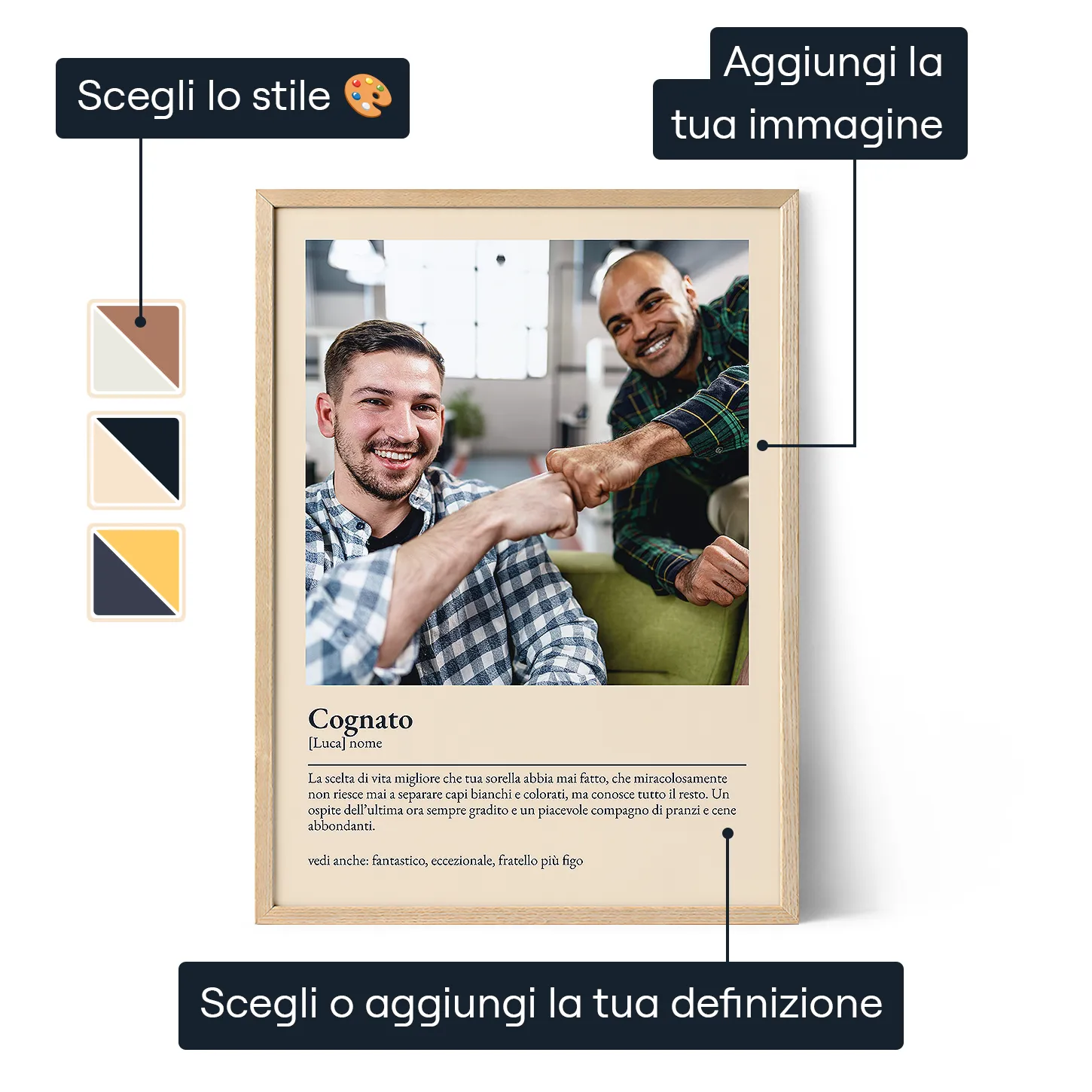 Offriamo la personalizzazione gratuita su ogni ordine, così ogni prodotto è unico e perfettamente in linea con le tue preferenze. Il nostro editor online, facile e intuitivo, ti permette di creare la tua opera d’arte personalizzata in pochi passaggi, sia da computer che da cellulare. E con l'anteprima interattiva, puoi vedere il risultato in tempo reale e perfezionare ogni dettaglio prima dell'acquisto.