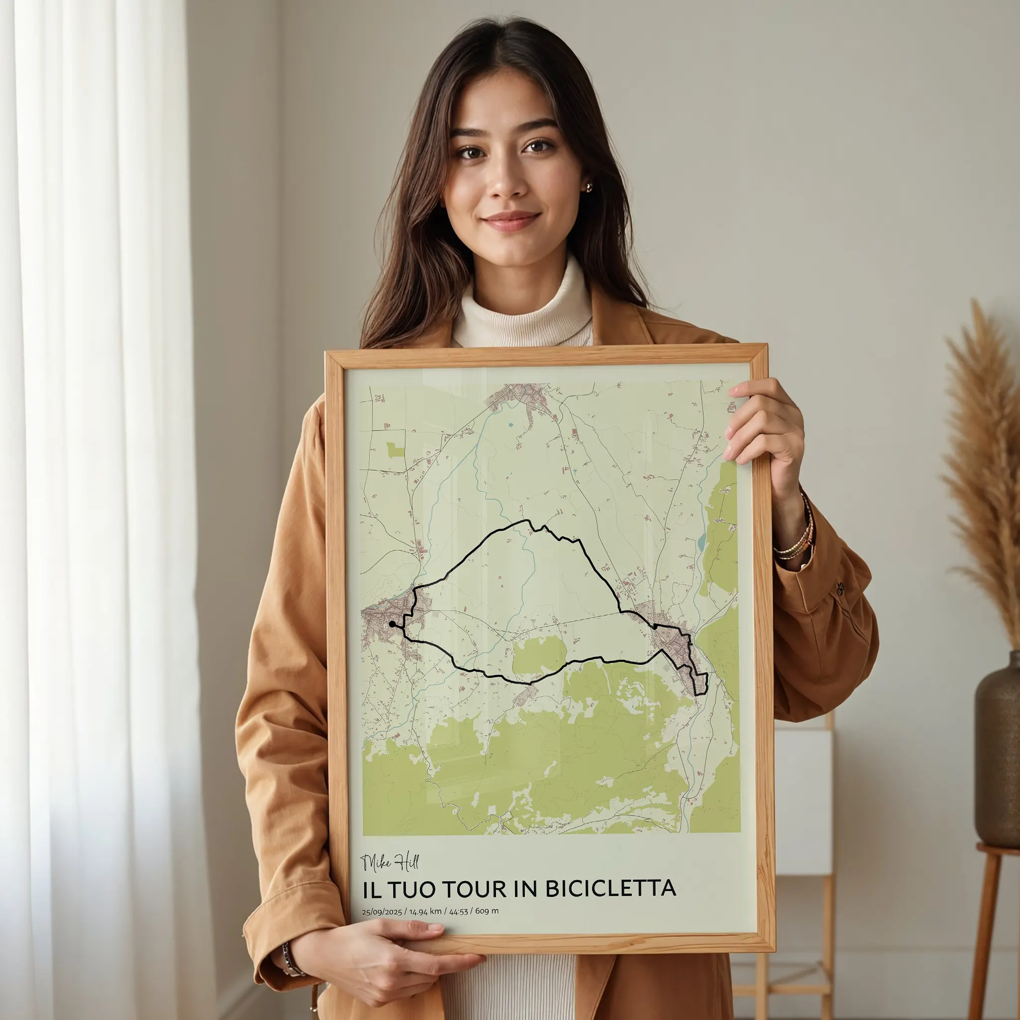 Trasforma il tuo percorso preferito in un poster personalizzato con mappa ciclistica, un regalo significativo per chi ama percorrere tanti chilometri indimenticabili a bordo di una bici