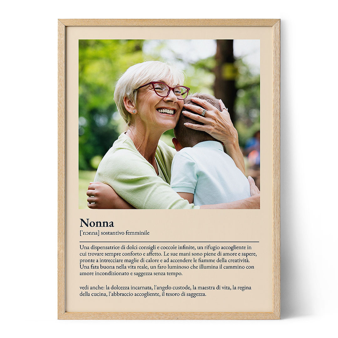 Cattura l'essenza della tua amata nonna con il nostro Poster Definizione di Nonna. Questa stampa personalizzata combina una foto cara con una definizione in stile dizionario di "nonna" o qualsiasi altra parola che la rappresenti. Che tu scelga una definizione divertente o profondamente emotiva, questo regalo le toccherà sicuramente il cuore.