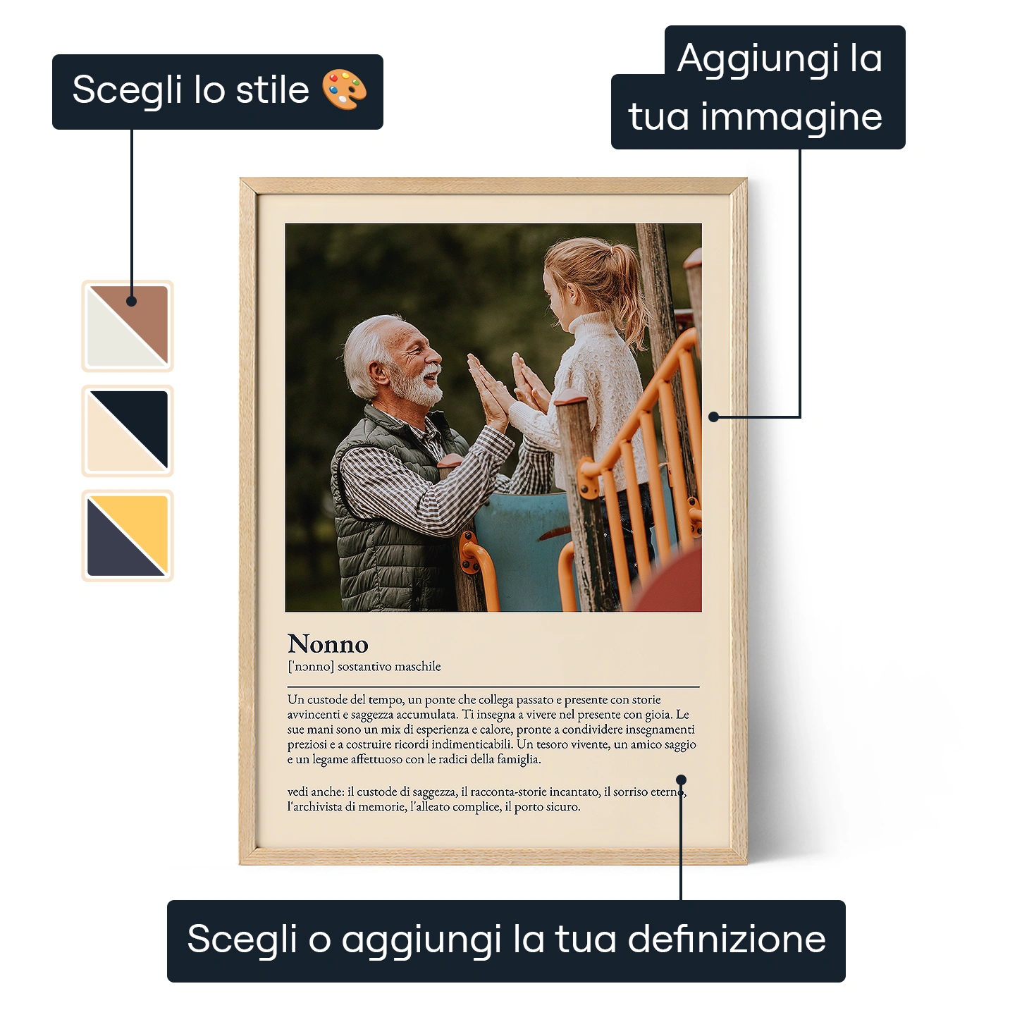 Onora il legame speciale che condividi con tuo nonno con il nostro Poster Definizione di Nonno. Questa stampa personalizzata combina una foto cara con una definizione in stile dizionario di "nonno" o qualsiasi altra parola che incarna la sua essenza. Che tu scelga una definizione umoristica o profondamente sentimentale, questo regalo sicuramente gli scalderà il cuore.