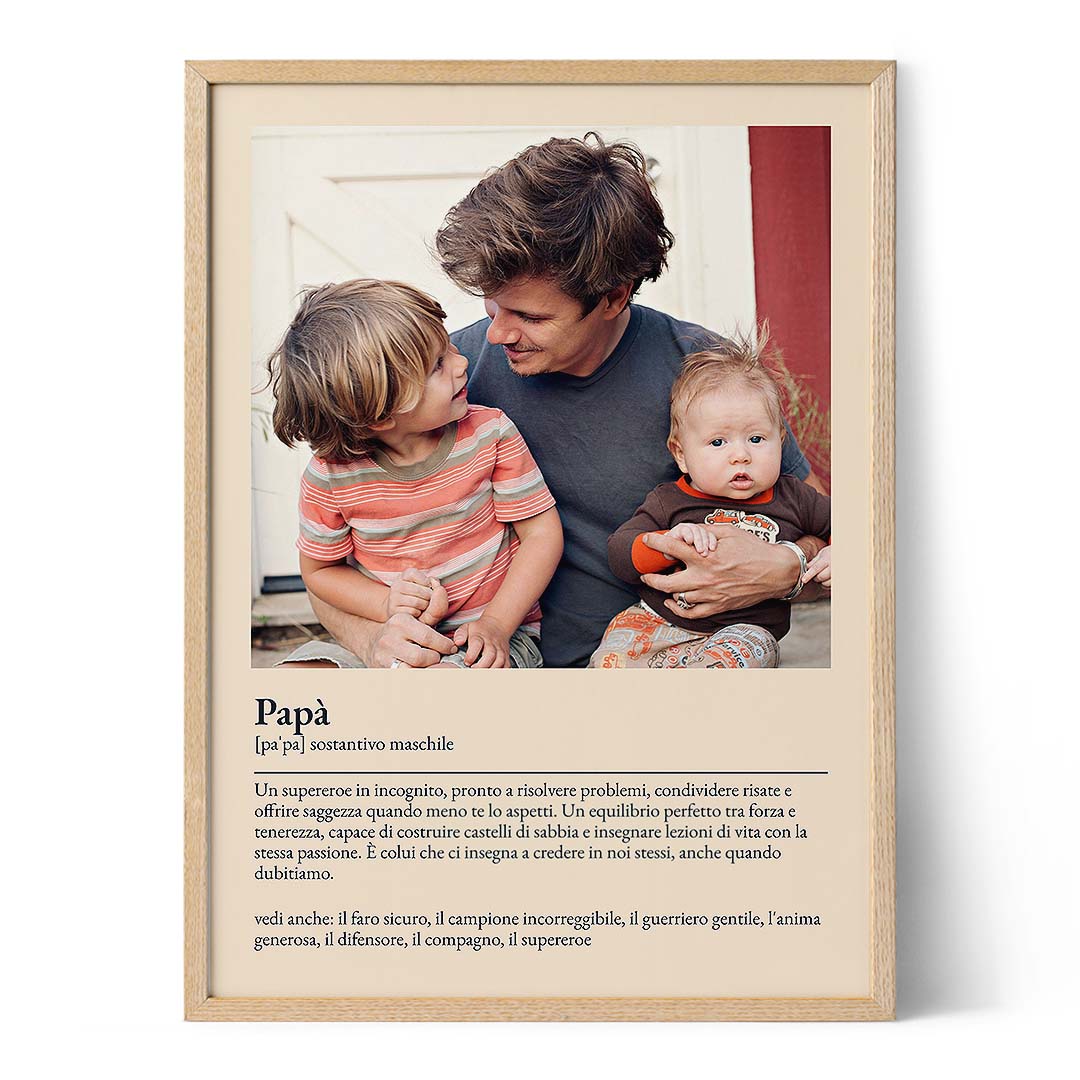 Se stai cercando il modo perfetto per onorare la figura paterna nella tua vita, il nostro "Poster Definizione di Papà" è proprio ciò che fa al caso tuo! Quest'arte murale personalizzata ti permette di creare un tributo unico a papà, celebrando tutte le qualità che lo rendono speciale. Scegli la sua parola preferita - che sia "papà," "papino," "padre," o un soprannome che tiene caro - e crea un pezzo d'arredo unico che lui tesorerà per anni a venire.