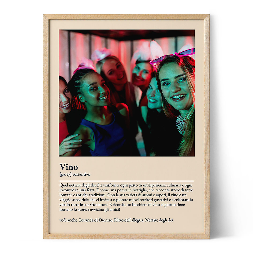 Regala un sorriso ai tuoi amici e ai tuoi cari con il nostro Poster Definizione di Vino. Questa stampa personalizzata presenta la tua foto e una definizione della parola "vino" dal dizionario. Che tu scelga una definizione divertente o spiritosa, dipende interamente da te. Inizia dirigendoti al nostro semplice editor online. Scegli il tuo schema di colori o personalizzalo selezionando i tuoi colori di sfondo e testo. Quindi, carica la tua foto, inserisci il titolo e aggiungi la definizione. Puoi utilizzare la nostra definizione predefinita o crearne una tua unica.