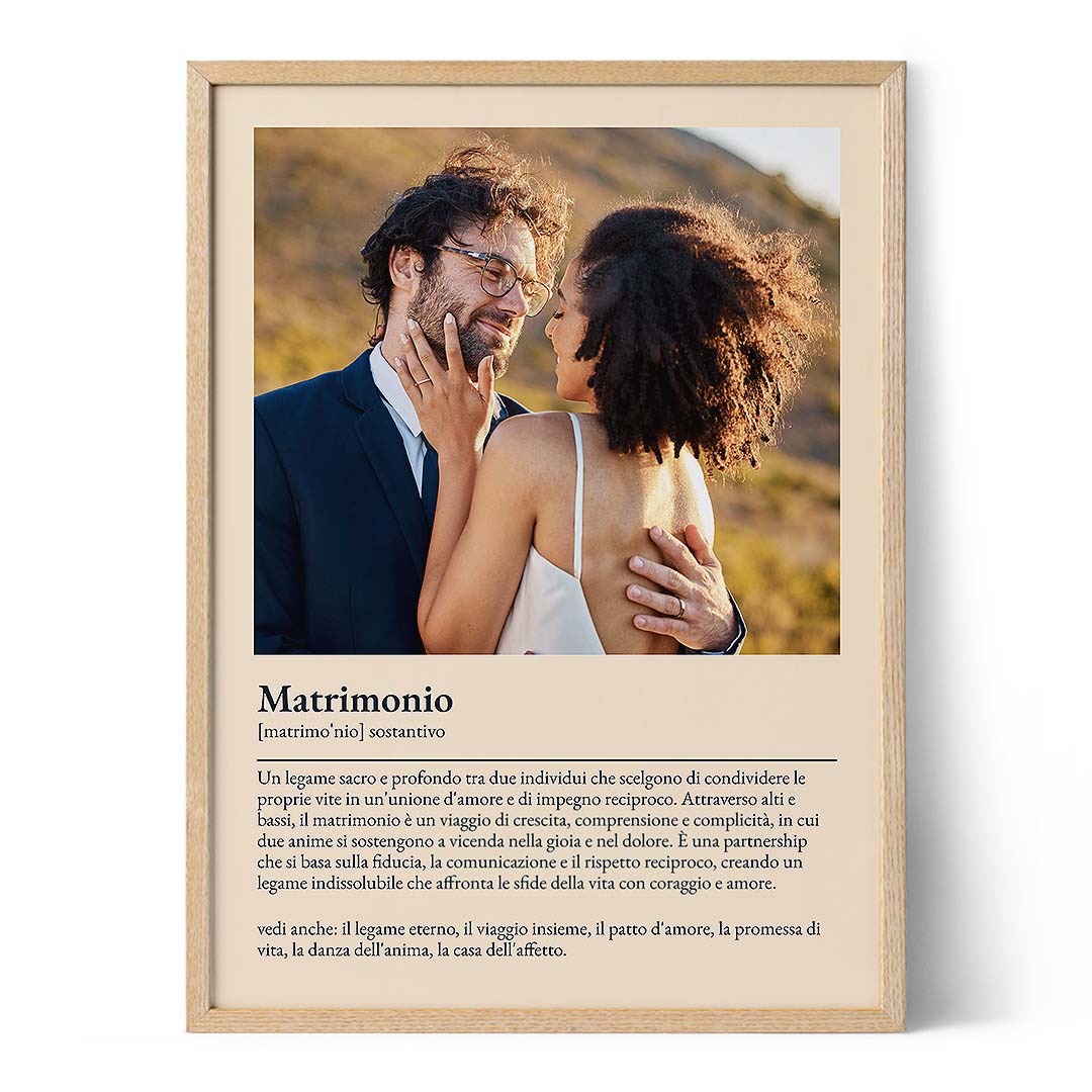Stai cercando un modo unico e significativo per celebrare un matrimonio? Il nostro Poster di Definizione di Matrimonio è il regalo personalizzato perfetto. Cattura l'essenza di questo bellissimo impegno con una definizione personalizzata e una foto che parla al cuore.