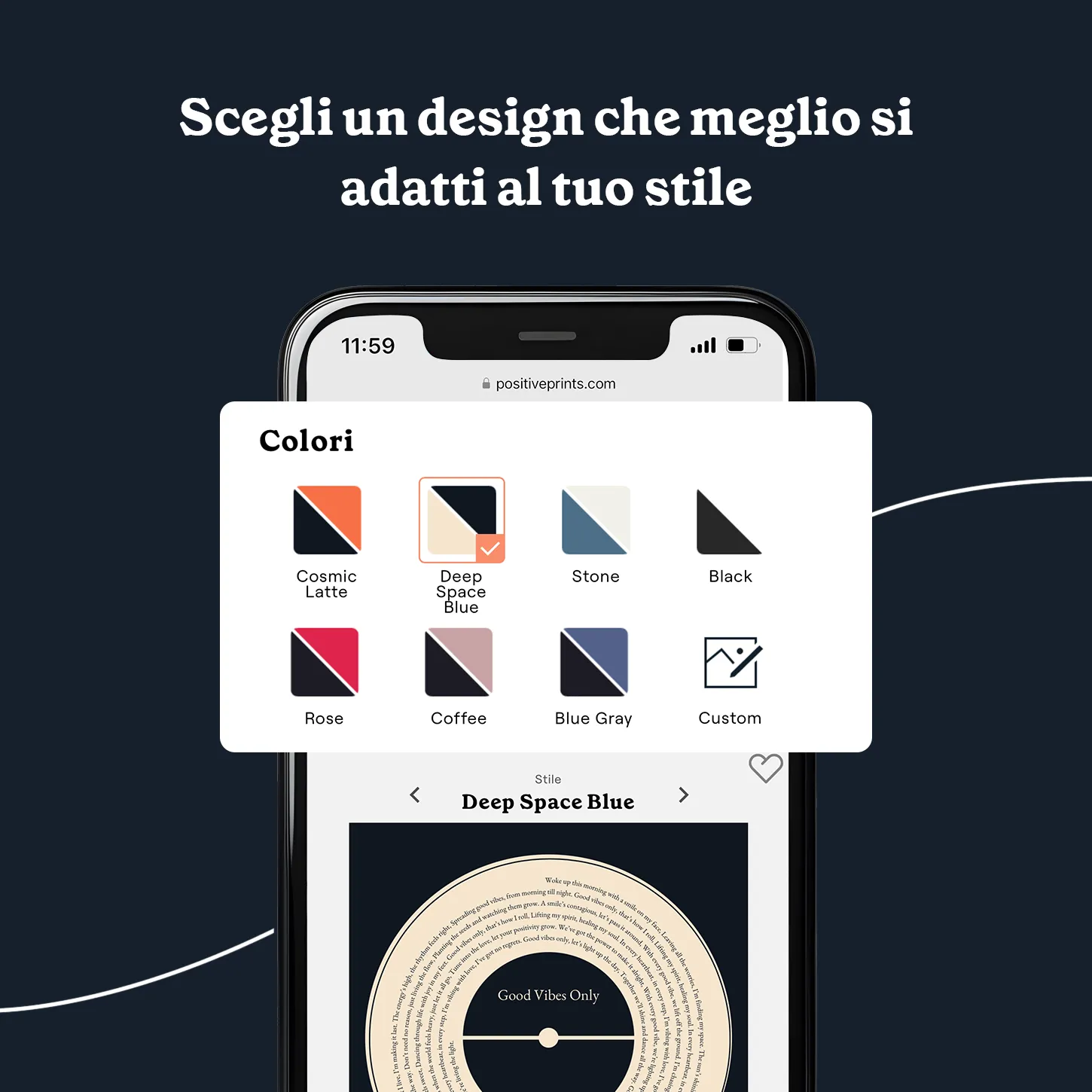 Offriamo la personalizzazione gratuita su ogni ordine, così ogni prodotto è unico e perfettamente in linea con le tue preferenze. Il nostro editor online, facile e intuitivo, ti permette di creare la tua opera d’arte personalizzata in pochi passaggi, sia da computer che da cellulare. E con l'anteprima interattiva, puoi vedere il risultato in tempo reale e perfezionare ogni dettaglio prima dell'acquisto.