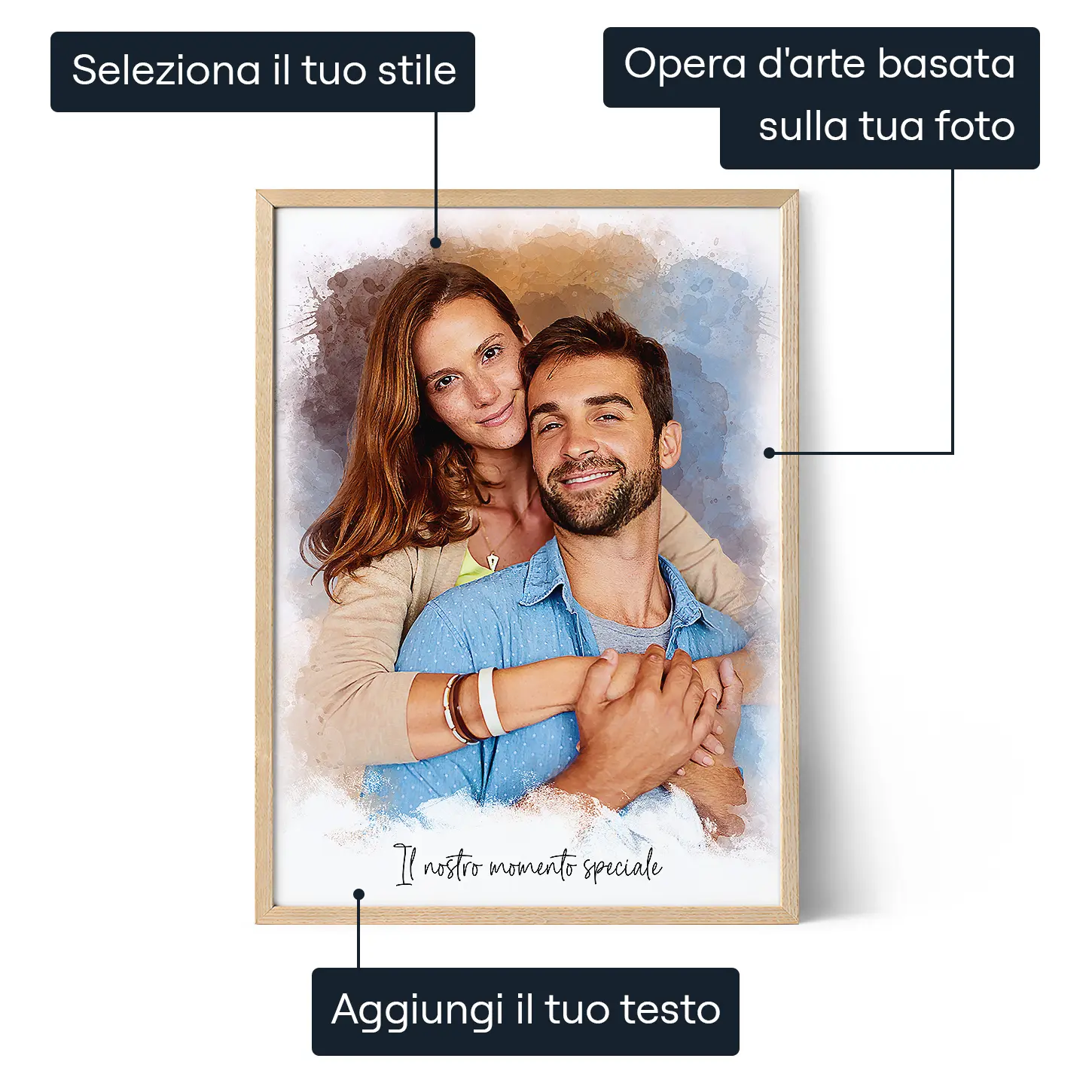 Trasforma una foto che ami in uno splendido ritratto personalizzato che puoi stampare su un poster o una tela di alta qualità: un regalo personalizzato pieno di significato