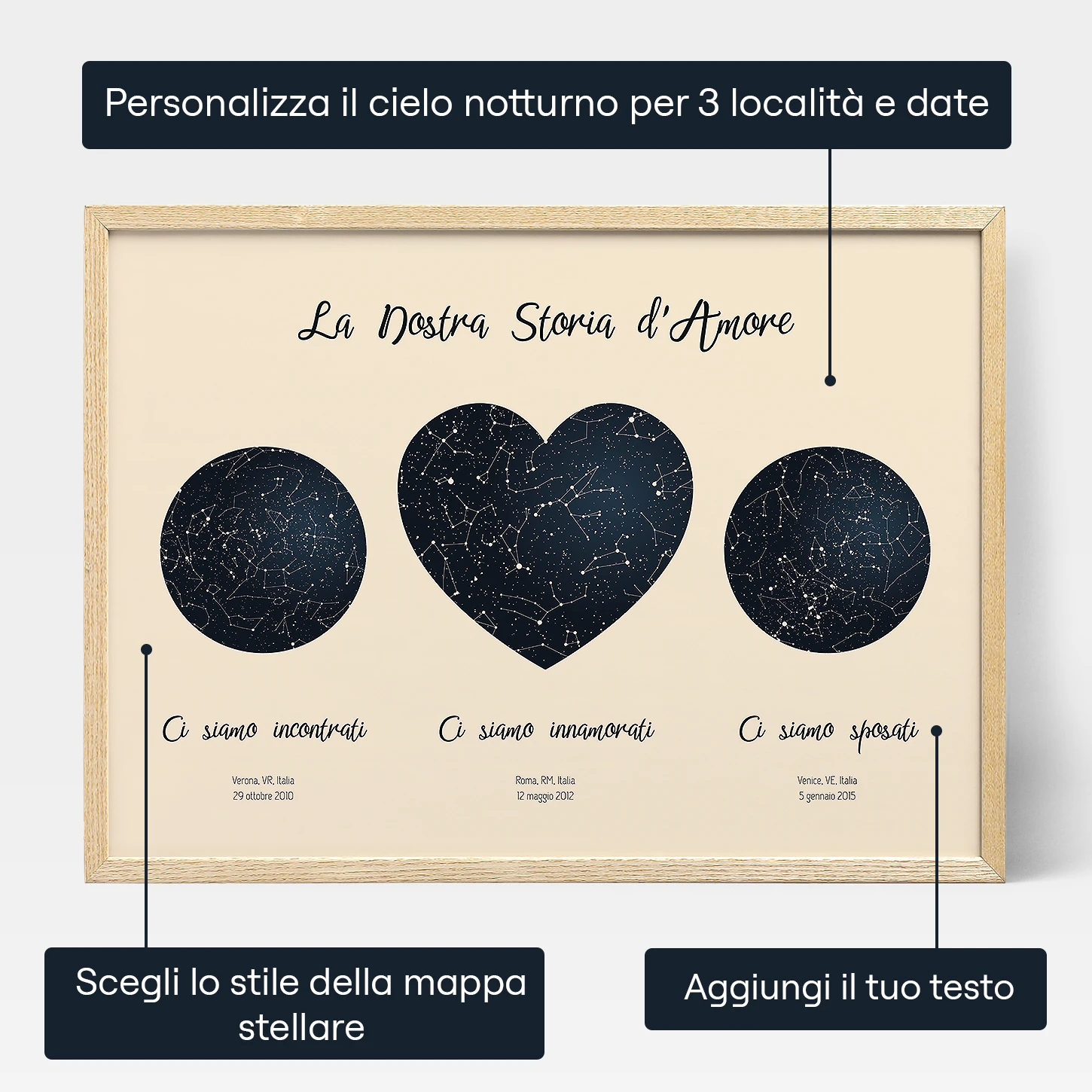 Siamo certi che questo regalo pieno d’amore sarà apprezzato per anni e anni, e sarà un bellissimo ricordo dei vostri traguardi raggiunti insieme. Ordina subito la Tripla Mappa Stellare della Nostra Storia d’Amore e sorprendi la tua anima gemella con un regalo unico e creato su misura.