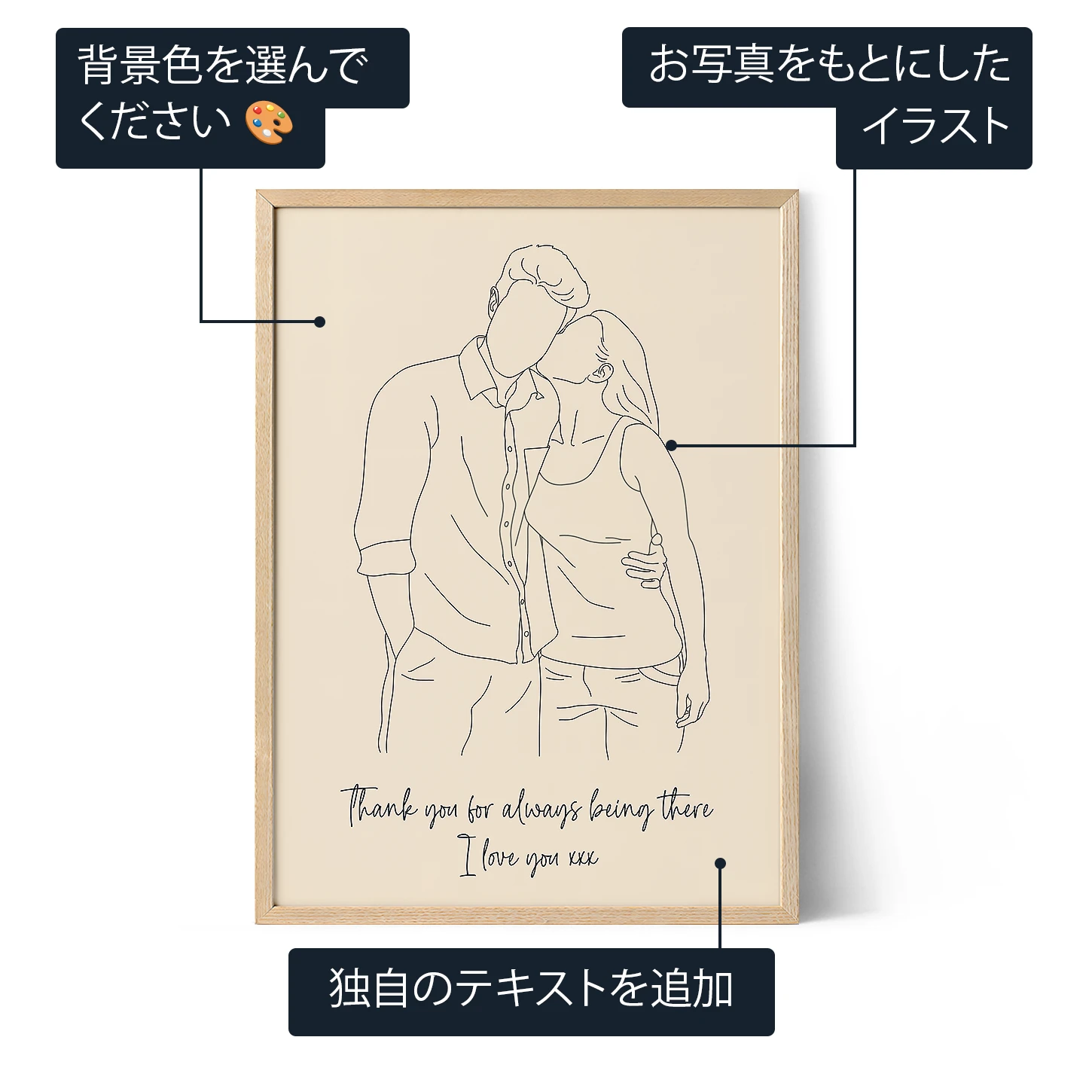 完璧で心のこもった贈り物をお探しだろうか? これ以上探す必要はない! 私たちのカスタム・ラインアートは、シンプルな3ステップのプロセスで、感動と思い出に満ちたユニークな傑作を作ることができる。 お気に入りの写真を個性的なアート作品に変身させることで、愛を分かち合い、瞬間を大切にする。 記念日や誕生日、結婚式など様々な場面で、感謝の気持ちを伝えたり、誰かの一日を盛り上げたり、永遠の思い出を作ったりする素敵な方法だ。