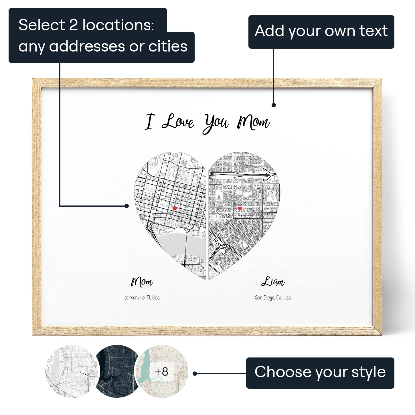 2つの地図に分かれた1つのハート、2つのハート、2つのスクエア、2つのサークルから選び、色をカスタマイズして、自分だけのプレゼントを作ることができます! あなたとお母さんの正確な住所をハートのピンでマークします。 さらに、お二人のお名前やご住所、お二人にとって特別な意味を持つ感傷的な言葉や文章を入れることができるカスタムテキストを追加してください。