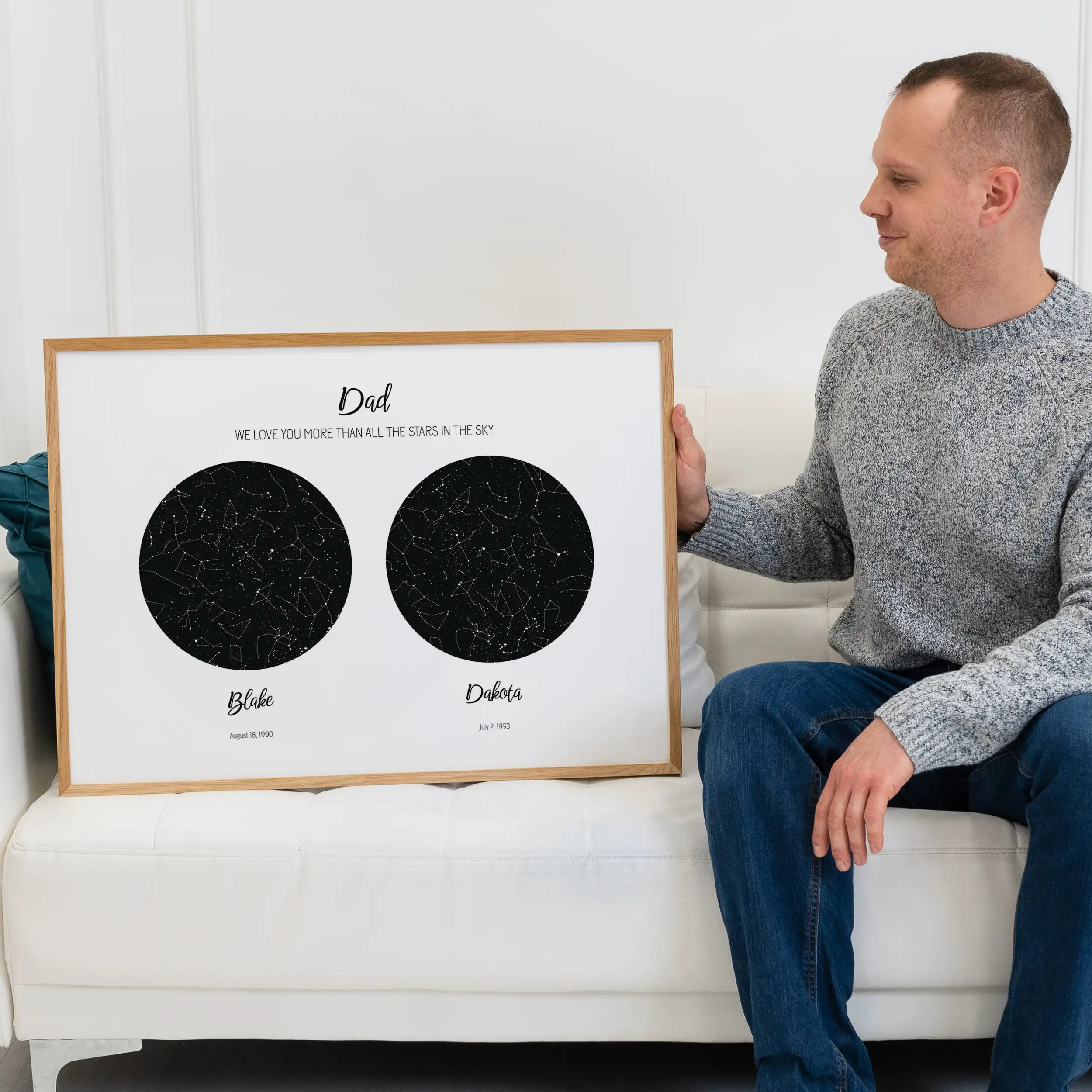 このプリントには、お子様一人ひとりのお名前と出生時刻を追加するオプションが含まれており、世界に一つだけの作品になります。 父の日のプレゼントや誕生日プレゼント、大切な人への思いやりなど、「お父さん用ダブルスターマップ」は、忘れられない贈り物として、末永くご愛用いただけるでしょう。