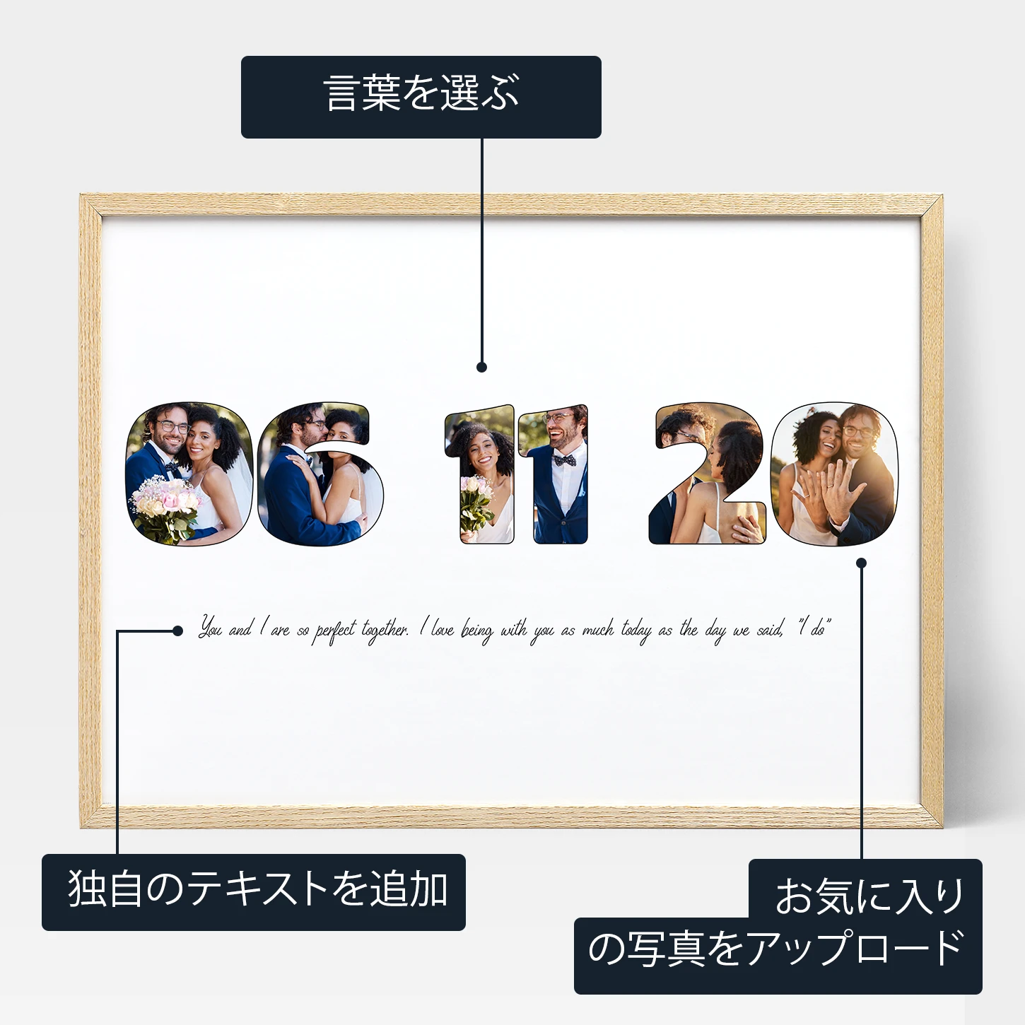 アニバーサリー・レター・フォトコラージュでパートナーを驚かせ、記念日を本当に思い出深いものにしよう。 この名入れ記念日の贈り物は、ふたりの関係の本質をとらえ、永遠の思い出を作る。 名入れアートのパワーを取り入れて、愛する人にその大切さを伝えよう。 この心のこもった素晴らしいギフトで、記念日をスタイリッシュに祝おう。 それは生涯大切にされる愛の証だ。