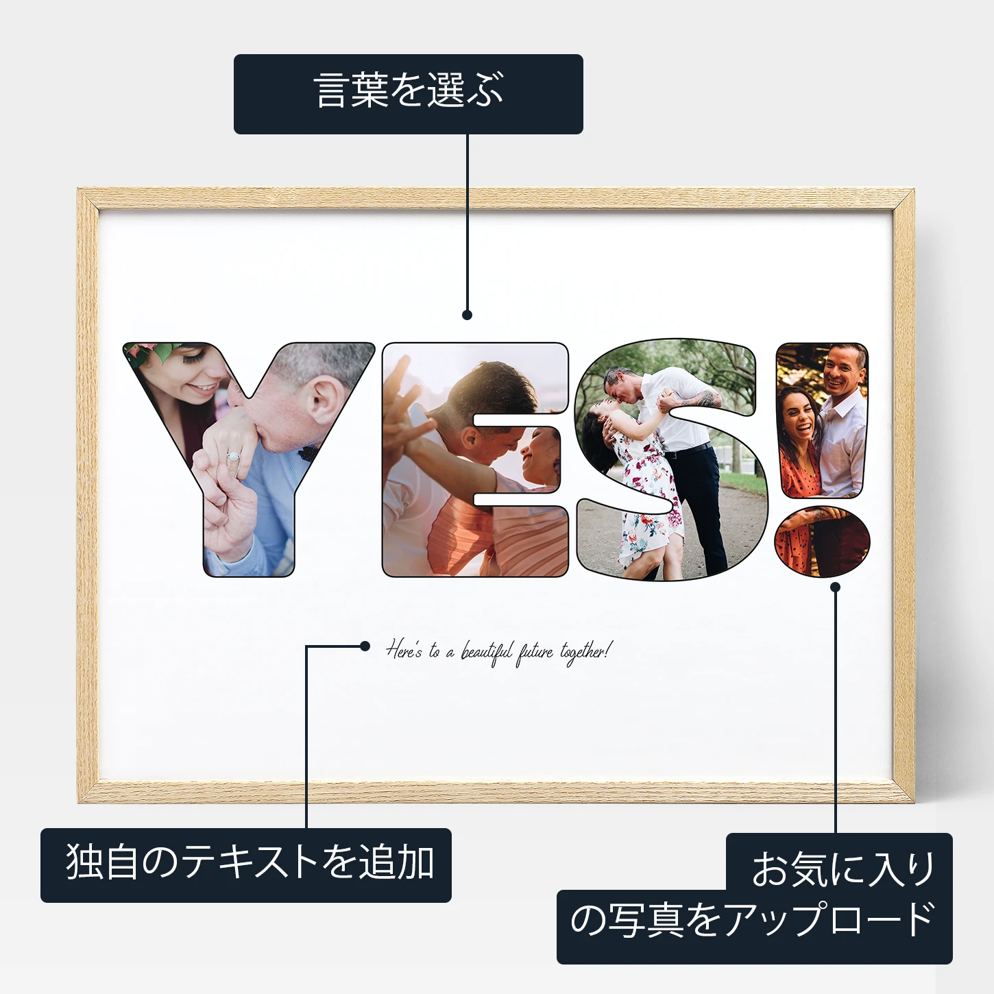 エンゲージメント・レター・フォトコラージュは、婚約のためのクールな贈り物だ。 あなただけの特別なプリントやキャンバスだ! 写真をコラージュしたもので、好きな短い単語を選ぶことができる。 婚約の日付であったり、"イエス!"、"婚約中"、"愛している "といった言葉であったりする。 君が決めてくれ!