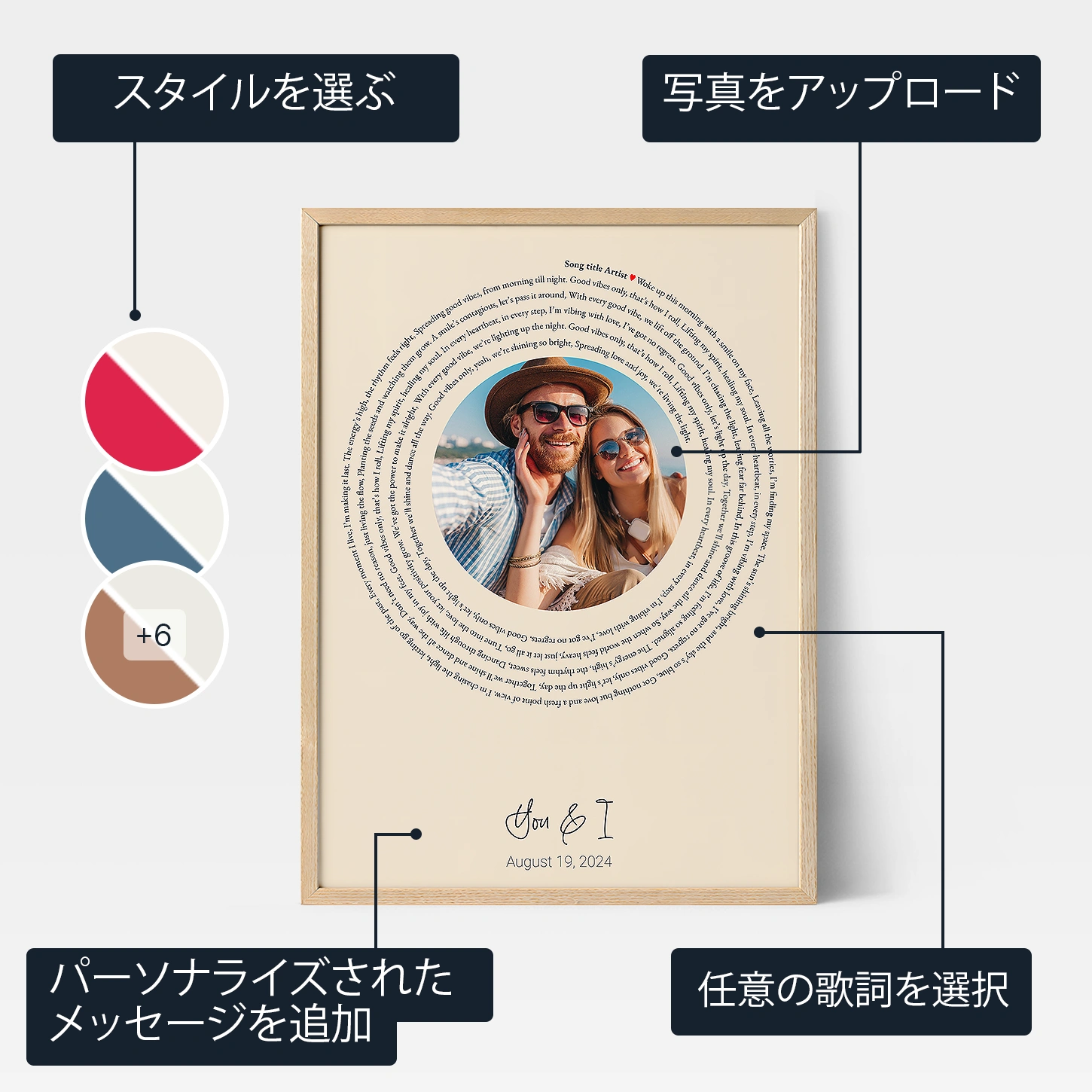 心のこもった贈り物を作る準備はできた?今すぐカスタム歌詞アートのパーソナライズを始めよう。オンラインエディターで背景を選び、歌詞を入力し、あなただけのメッセージを加えよう。あなたのスタイルに合ったフォーマットを選択すれば、準備は完了!