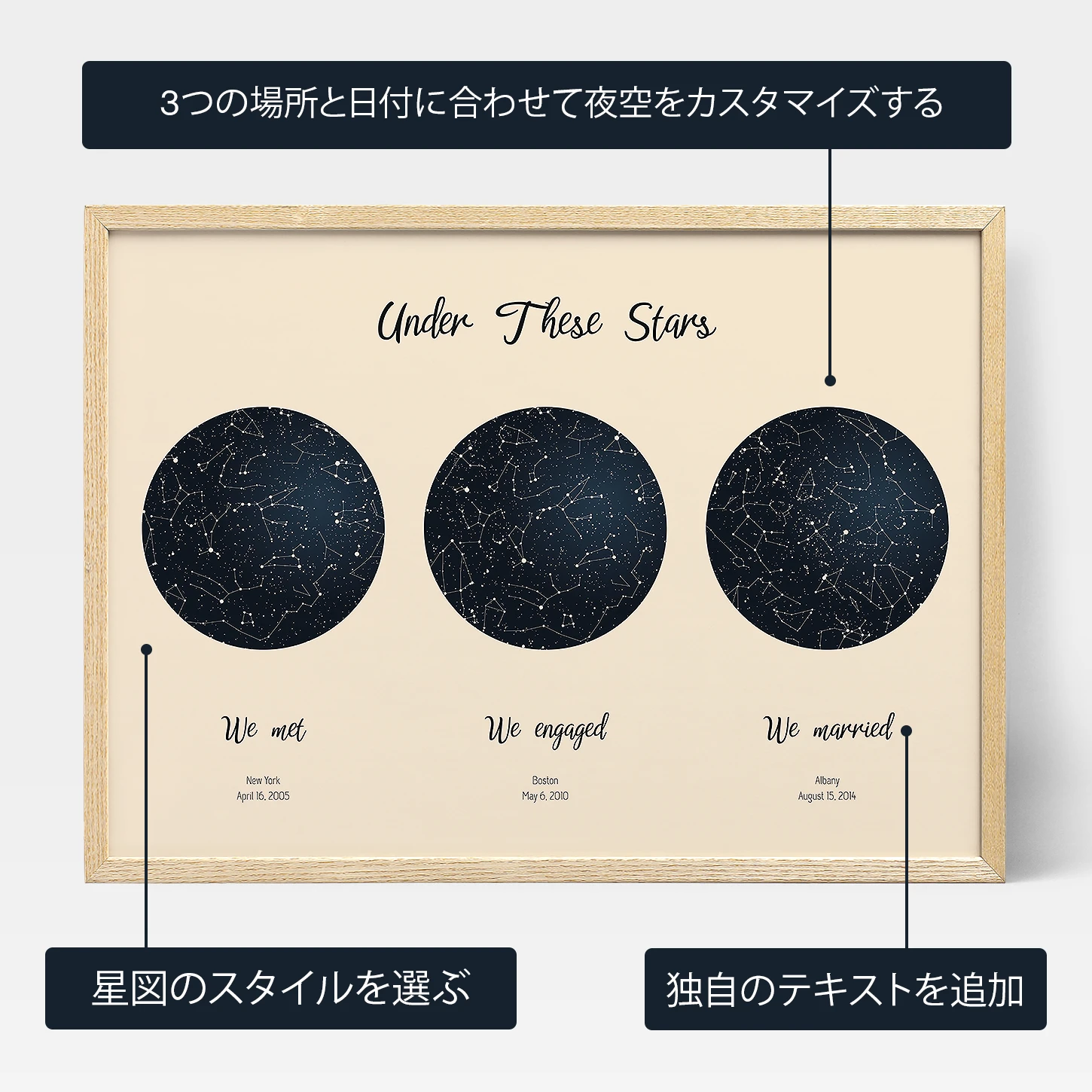 - 3つの場所と日時から見える星空を、自分だけの星図にする。