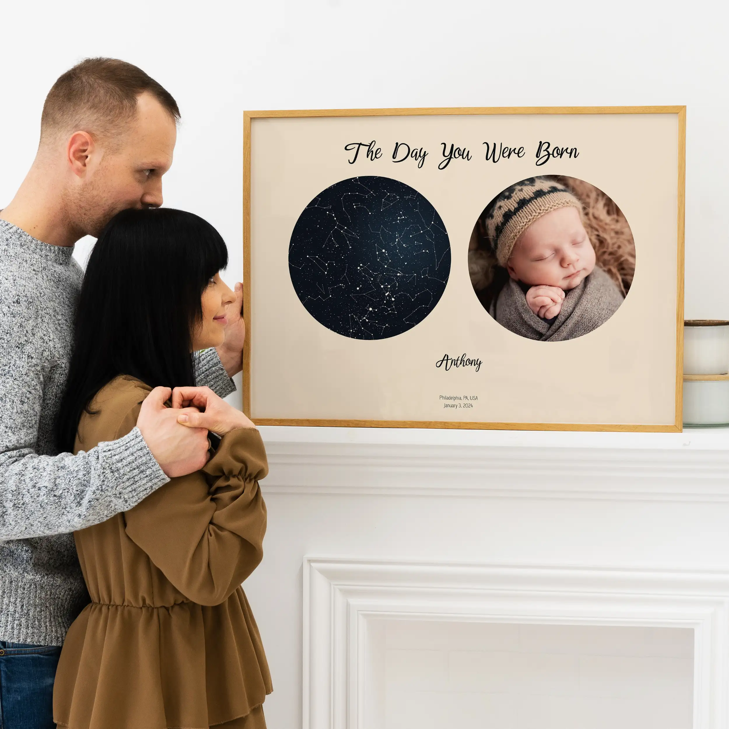 写真と一緒に生まれた日」で、これまでにない誕生 日を祝おう。 最初であろうと、20番目であろうと、30番目であろうと、80番目であろうと、この贈り物は時代を超えた宝物である。 愛する人の出生時刻と出生地、そして写真を星図の 横に追加する。 メインタイトルの "The Day You Were Born "は、このパーソナライズされたアートワークの本質を捉えている。