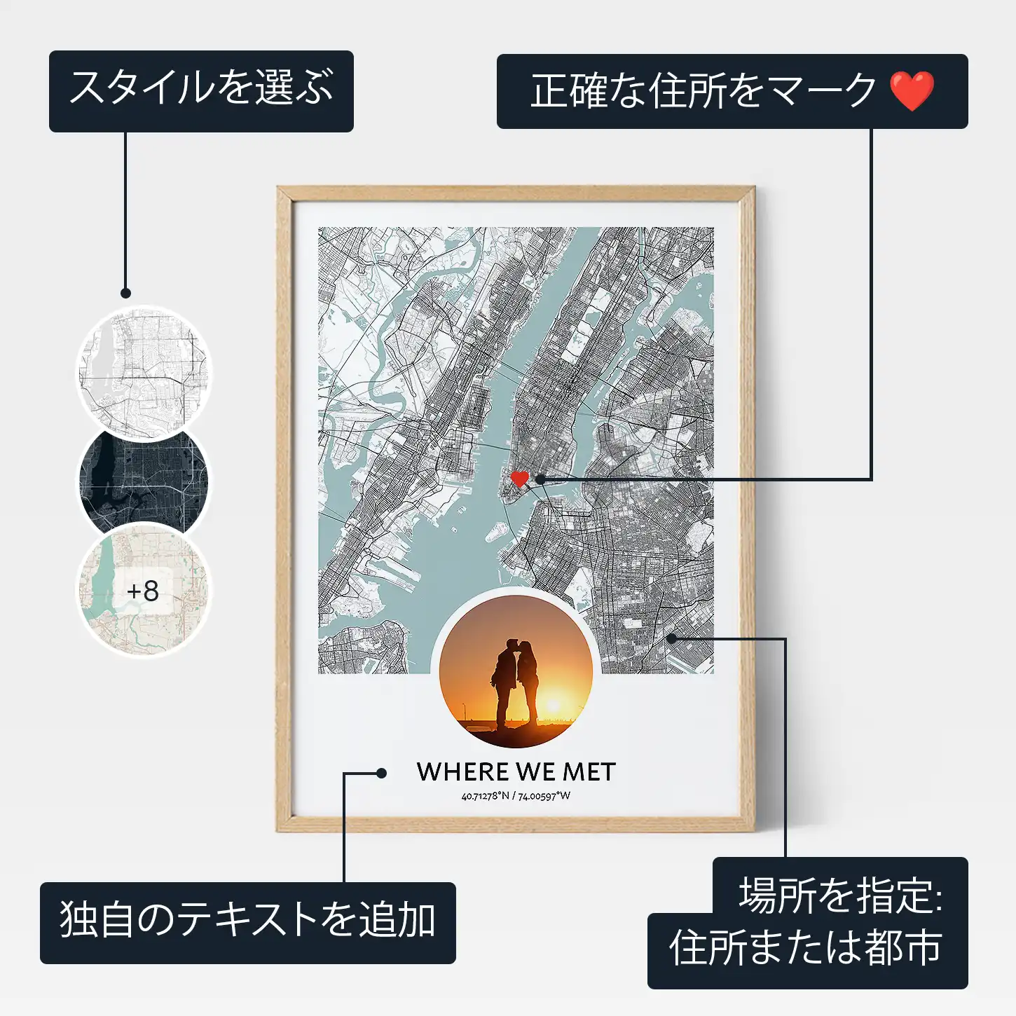 写真入りWhere We Met Mapは、記念日、誕生日、バレンタインデー、結婚式など、特別な日のためのユニークで心のこもった贈り物だ。 二人の絆を表現したプレゼントを贈って、二人の旅を祝福しよう。