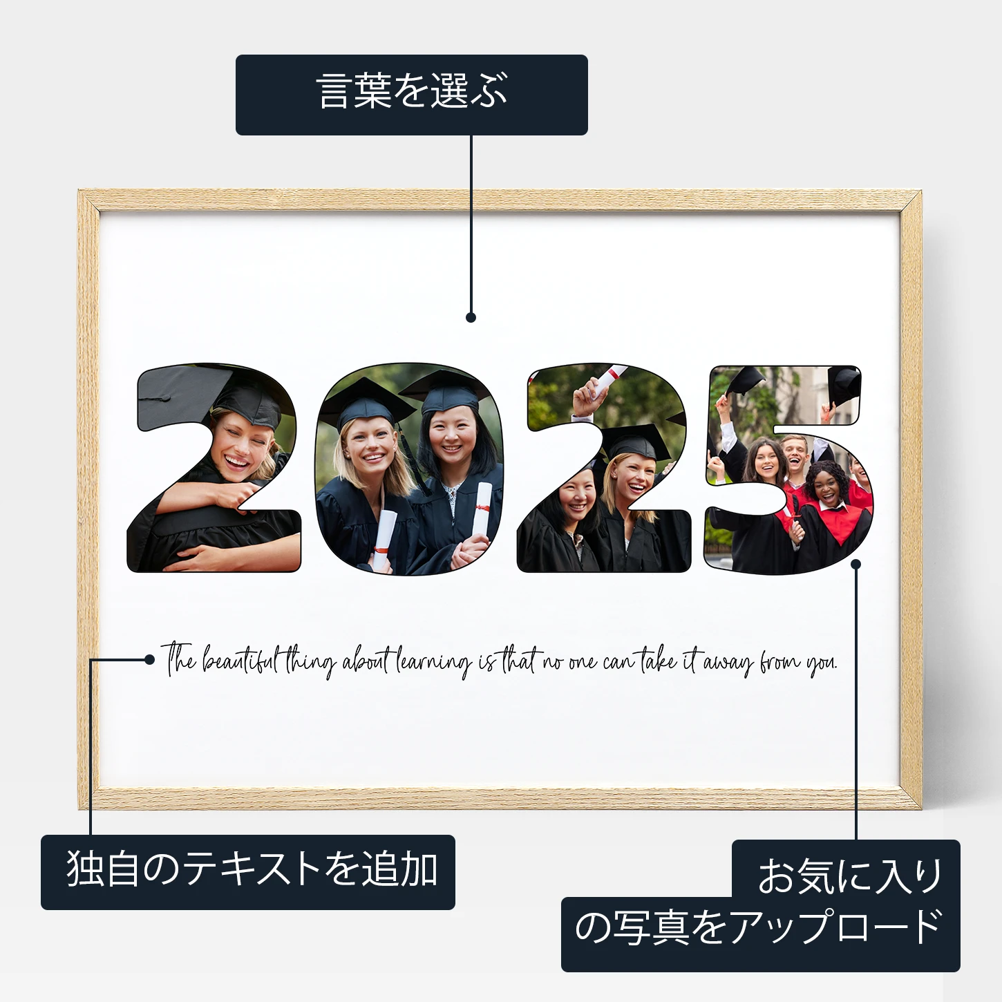 卒業年度フォトコラージュの作成は、単語(または数字)を選び、写真をアップロードするだけで開始できます。 この技術により、写真を数字や言葉の形に並べることができ、あなたの選んだデザインを正確に表現したコラージュが完成します。 その後、ポスター、キャンバス、フレームプリント、セルフプリント用のデジタルダウンロードファイルから選択し、プリント形式をカスタマイズすることができます。