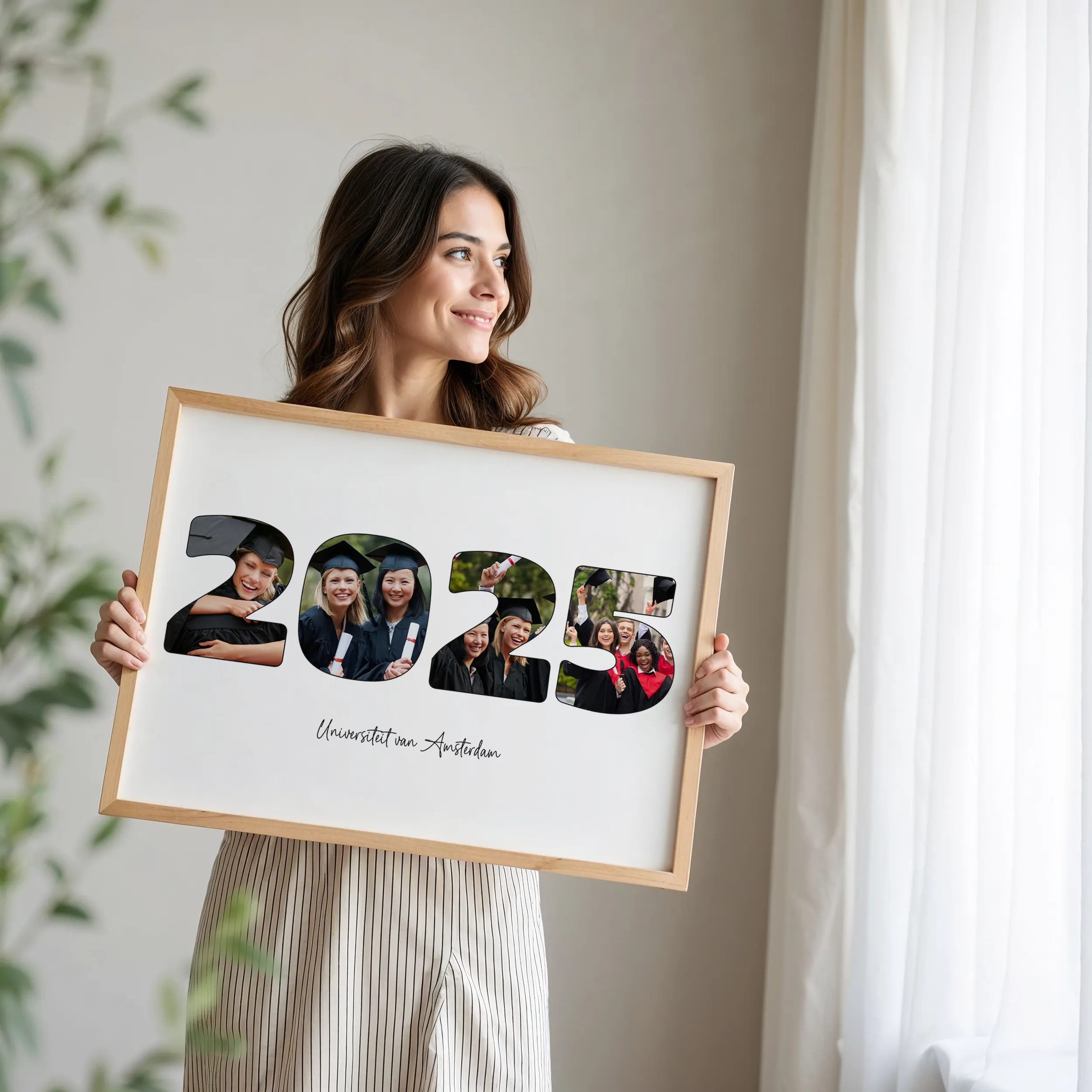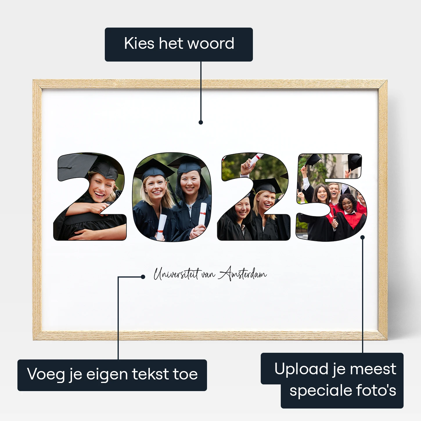 Om je afstudeerjaar fotocollage te maken kies je gewoon een woord (of nummer) en upload je foto's. Met onze technologie kun je de foto's rangschikken in de gekozen cijfer- of woordvorm, zodat je collage een nauwkeurige weergave is van je gekozen ontwerp. Je kunt dan het afdrukformaat aanpassen en kiezen uit posters, canvas of ingelijste afdrukken, of digitale downloadbestanden om zelf af te drukken.