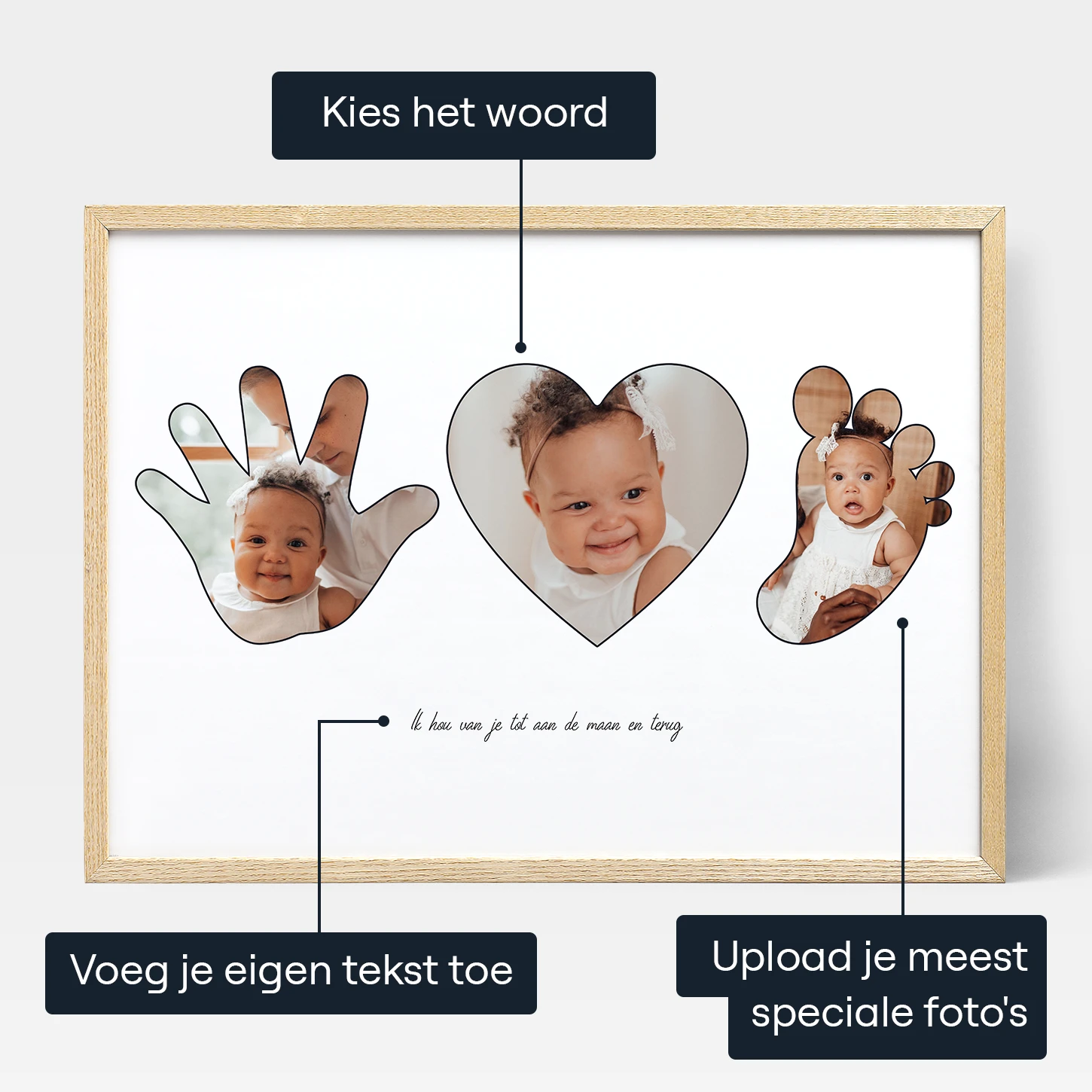 Na het afronden van je lay-out is het tijd om je foto's te uploaden. Je kunt eenvoudig een foto uploaden voor elk symbool en met onze editor kun je inzoomen, de positie aanpassen en zelfs een persoonlijke boodschap toevoegen onder de foto's. Op deze manier kun je een hartelijk tintje aan je collage geven. Kies tot slot de gewenste grootte en het gewenste formaat voor je Baby fotocollage. Of je nu de voorkeur geeft aan een ingelijste poster, een geprint canvas of een direct digitaal downloadbestand, we hebben opties die aan je wensen voldoen.