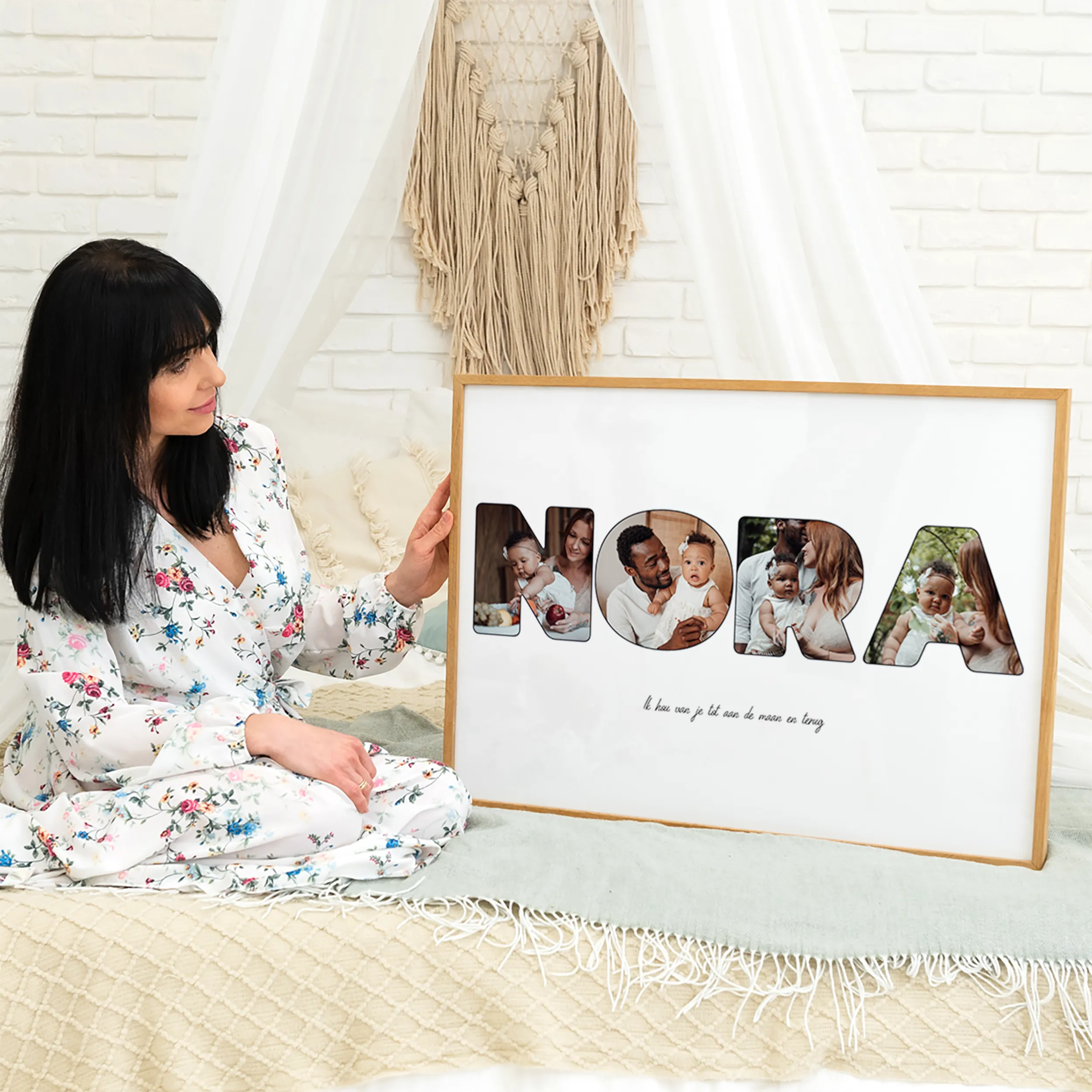 De fotocollage met babynaam is een speciaal en uniek gepersonaliseerd geboortecadeau dat nieuwe ouders blij zal maken en een perfect decoratief tintje zal geven aan elke babykamer. Deze gepersonaliseerde afdruk of canvas wordt gemaakt met de naam van de baby aan de hand van hun eigen foto's, waardoor het echt uniek is.