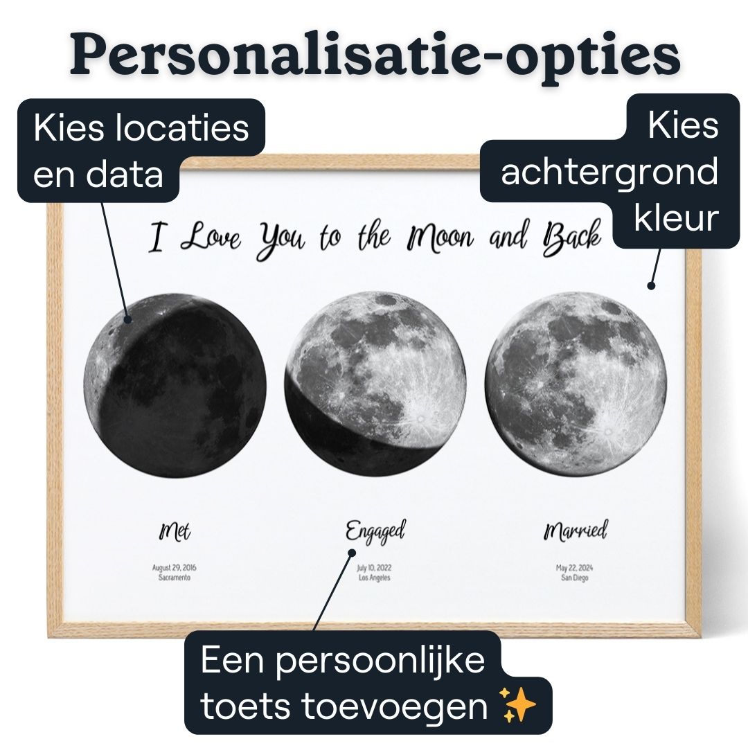 Nadat je de titel hebt ingesteld, voer je de data en locaties in om de maanfasen vanaf de geboortedata van elk kind weer te geven. Onder elke maanfase kun je namen, geboortedata of andere tekst toevoegen om het nog persoonlijker te maken. Kies tot slot het formaat van je kunstwerk. We bieden verschillende formaten en stijlen, waaronder gedrukte of ingelijste posterafdrukken, canvasdoeken en directe digitale downloads.