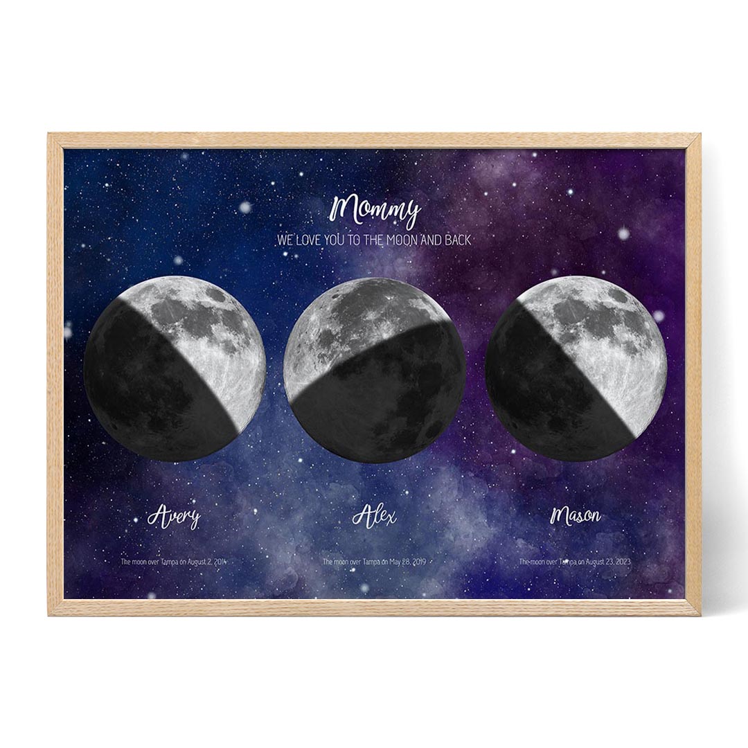 Op zoek naar een oprecht en uniek cadeau dat de speciale band tussen mama en haar kinderen viert? Three Moons for Mom is een persoonlijke print of canvas die de magie van het moederschap prachtig vastlegt. Met drie maanfasen - één voor elk van haar kinderen - is dit prachtige kunstwerk de perfecte manier om mama te eren en een blijvend aandenken te maken dat ze voor altijd zal koesteren.