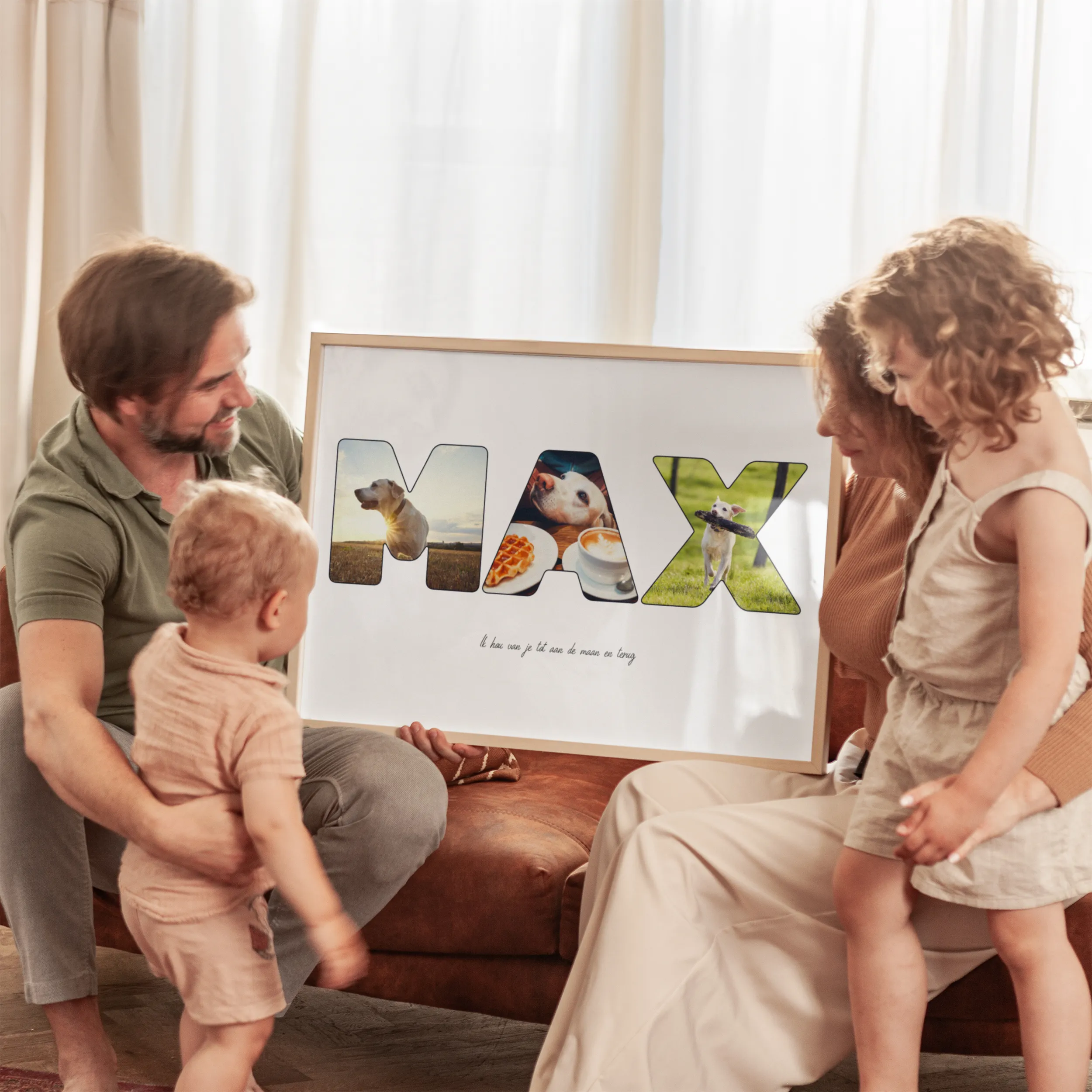 Op zoek naar het perfecte cadeau voor hondenliefhebbers? Kijk niet verder dan de Hondenletter fotocollage! Deze persoonlijke print of canvas is een speciale en unieke manier om de band tussen jou en je geliefde huisdier te vieren. Met deze unieke collage kun je je favoriete foto's omtoveren tot de naam van je hond of een ander woord dat een speciale betekenis heeft in je hart.