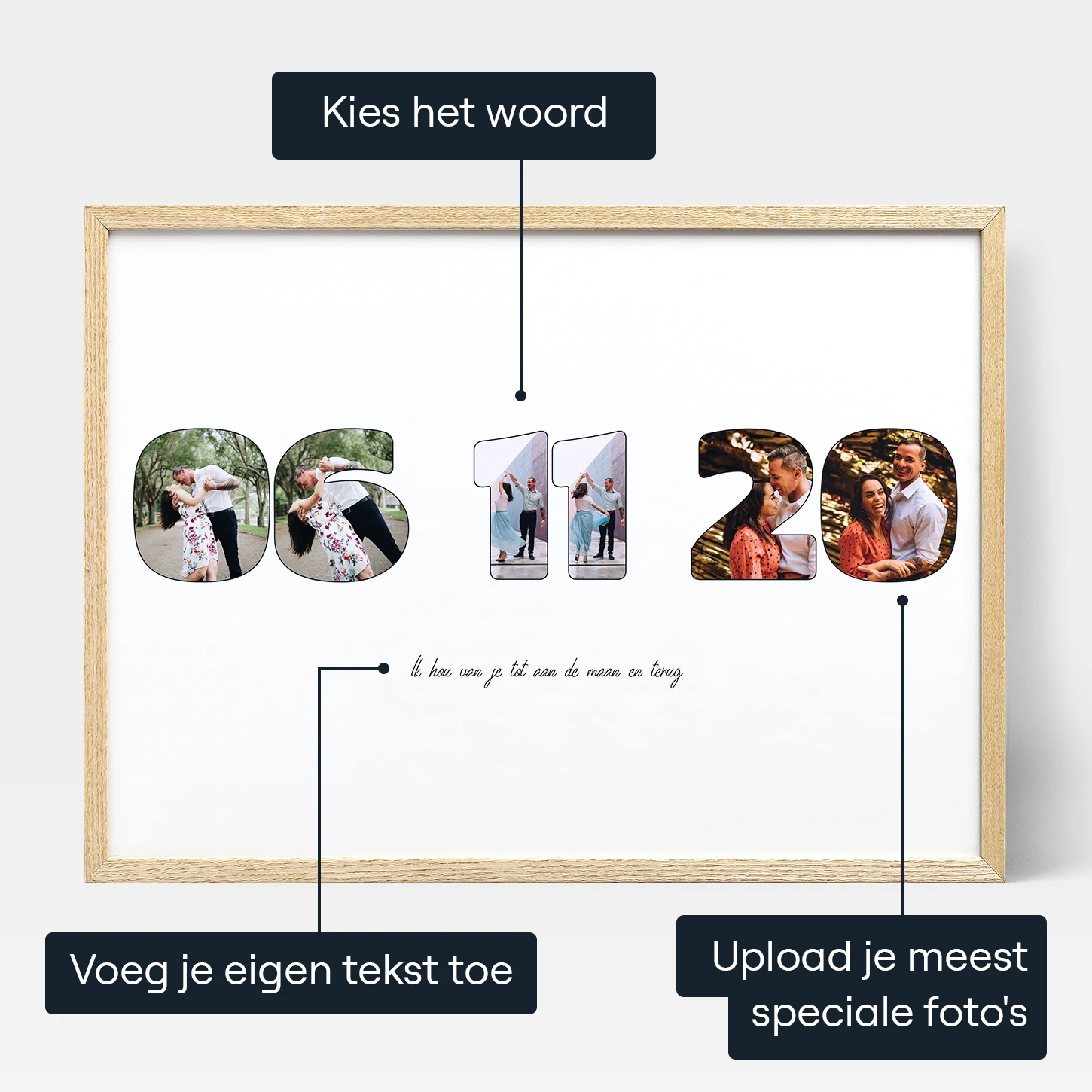 De Anniversary Letter Photo Collage is een geweldig cadeau dat speciaal is ontworpen voor jubilea. Het is een persoonlijke afdruk of canvas die een uniek tintje geeft aan je jubileum. Met deze collage kun je een woord of teken maken met je eigen foto's. Je hebt de vrijheid om elk gewenst kort woord te kiezen, zoals jullie trouwdatum of betekenisvolle woorden als "samen", "voor altijd" of "liefde". De mogelijkheden zijn eindeloos, zodat je er echt iets bijzonders van kunt maken. Je hoeft alleen maar een foto voor elke letter te uploaden.