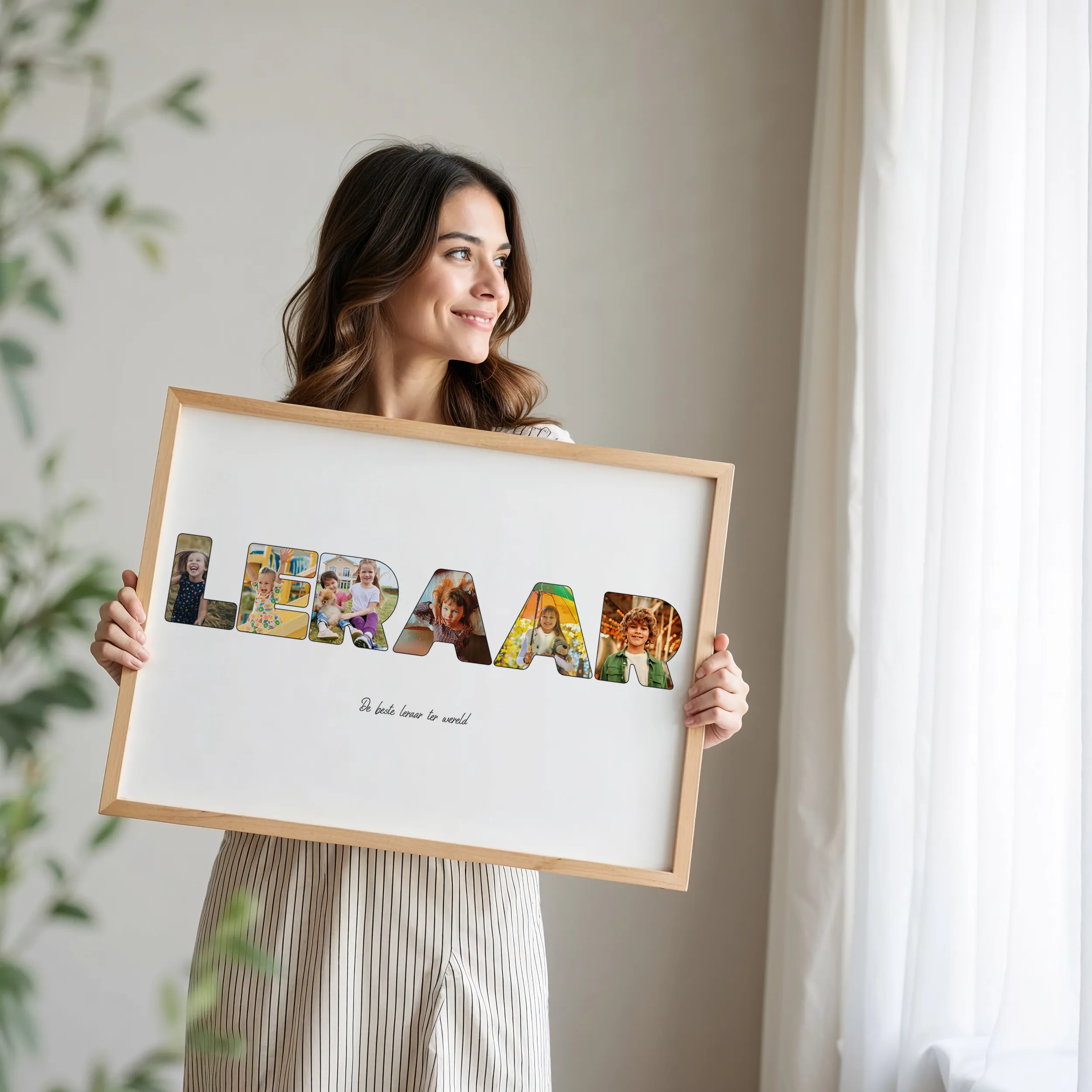Op zoek naar een uniek en attent leerkrachtcadeau om je waardering te tonen aan je leerkracht? Overweeg een Lerarenbrief Fotocollage! Deze gepersonaliseerde en creatieve collage toont je meest dierbare foto's en kunstwerken in de vorm van letters. Kies je eigen foto's en woorden om een uniek aandenken te maken dat nog jaren gekoesterd zal worden.