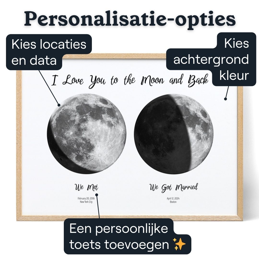 Zodra je de titel hebt ingesteld, voer je de data en locaties voor elke maanfase in. Zo zie je hoe de maan stond op de dagen waarop jij en je soulmate geboren zijn. Onder elke maan kun je namen of andere tekst toevoegen. Kies tot slot het formaat van je kunstwerk. We bieden verschillende formaten en stijlen, waaronder gedrukte of ingelijste posterafdrukken, canvasdoeken en directe digitale downloads.