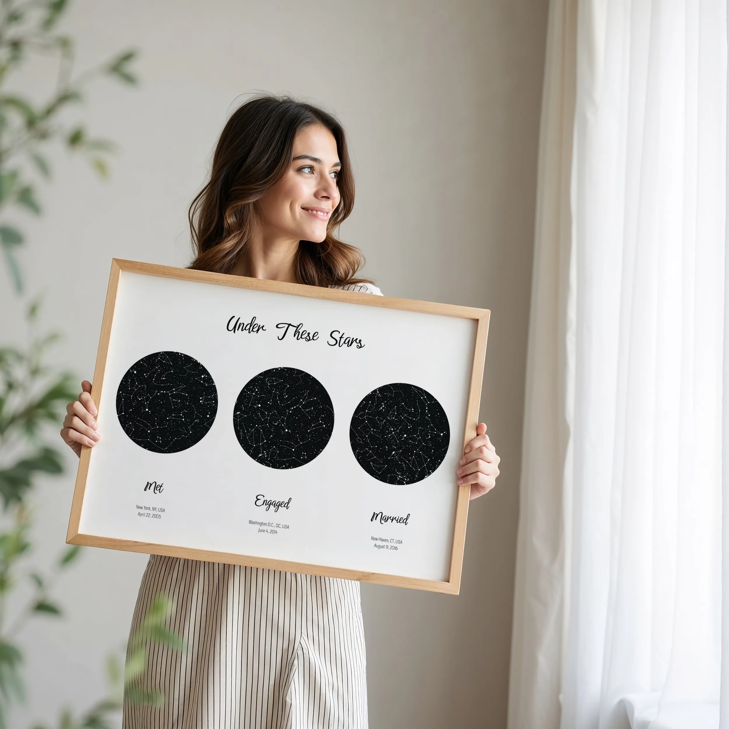 Deze speciale afdruk bevat drie aangepaste sterrenkaarten, die drie magische momenten in jullie leven als koppel vastleggen. De eerste sterrenkaart geeft het moment van jullie ontmoeting weer, met daaronder het woord "Ontmoet". De tweede kaart toont het hemelgezicht van de dag dat jullie je verloofden, met daaronder de woorden "Verloofd". En tot slot laat de derde sterrenkaart de fonkelende sterren op jullie huwelijksnacht zien, met het woord "Married" dat het plaatje compleet maakt.