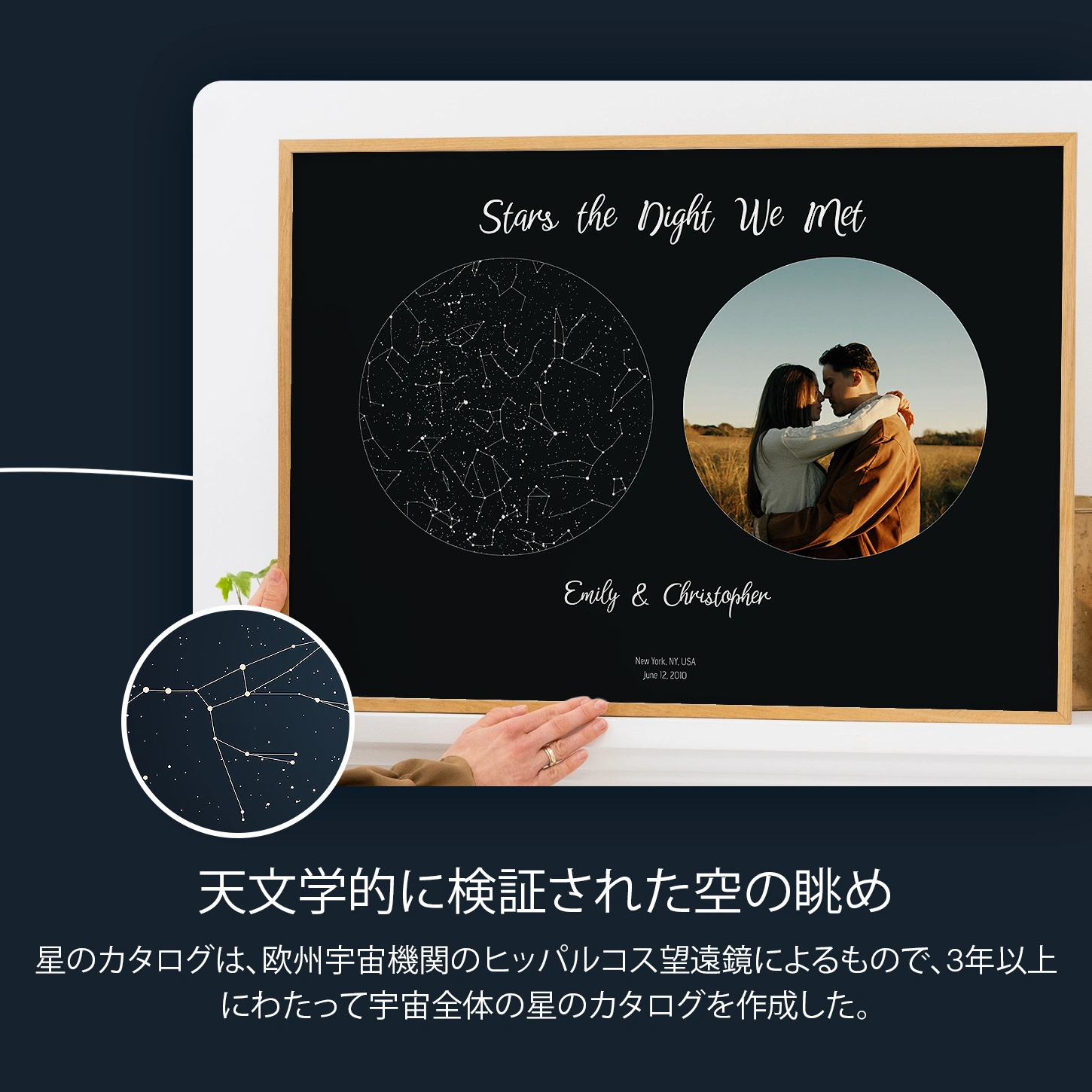 Romantiek en sterren kijken komen samen in "Stars the Night We Met Photo". Of het nu gaat om een jubileum, Valentijnsdag, Kerstmis of de verjaardag van je geliefde, dit cadeau laat de vonken van de liefde overslaan. Herdenk de magische nacht dat jullie elkaar ontmoetten met een sterrenkaart en een foto van jullie twee. "Stars the Night We Met" siert het artwork als de perfecte hoofdtitel.