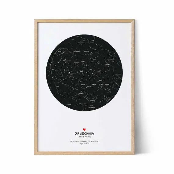 Daarom kiezen veel mensen voor een poster met een huwelijkssterrenkaart om vast te houden aan hun belangrijkste momenten. Deze posters bieden een nauwkeurige weergave van hoe de lucht eruit zag vanaf een specifieke locatie, datum en tijd. Als je naar je op maat gemaakte poster kijkt, kijk je ook naar de hemel van die hele speciale dag, zodat je je herinneringen kunt herbeleven via een sterrenhemelkaart.