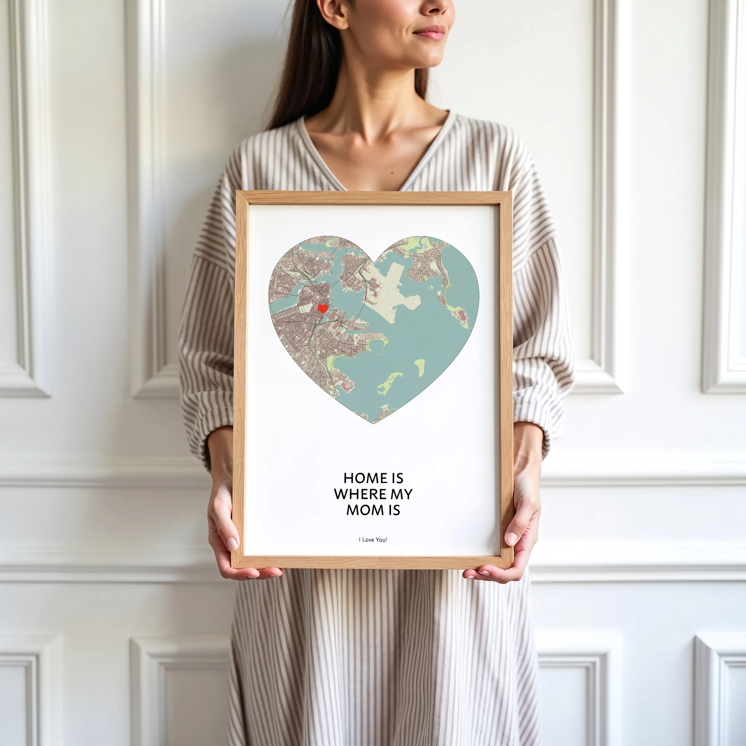 Dit prachtige kaart kunstwerk toont een locatie naar keuze met alle details die je op een kaart zou kunnen vinden. Laat een pin vallen op de plek waar je thuis bent om je moeder te laten zien dat je altijd in haar hart bent. Onze kaarten zijn het perfecte Moederdagcadeau en kunnen volledig worden gepersonaliseerd om haar een speciaal gevoel te geven.