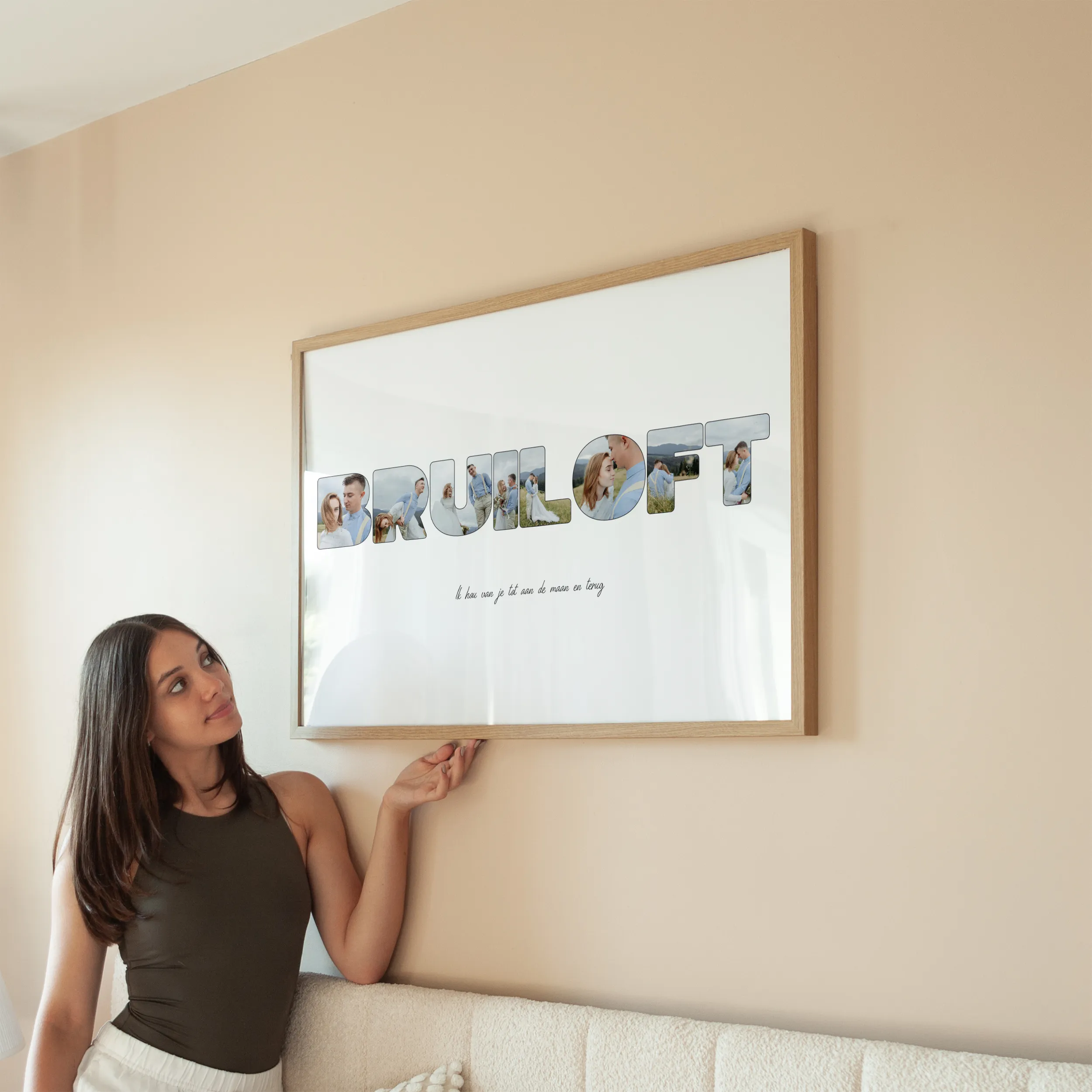 De fotocollage van de trouwbrief is een bijzonder en speciaal product dat speciaal is ontworpen voor bruiloften. Het dient als een opmerkelijke persoonlijke afdruk of canvas, waardoor het het perfecte huwelijkscadeau is. Deze fotocollage is uniek, zodat je je dierbare foto's kunt omtoveren tot een prachtig woord of teken. Of het nu gaat om de datum van jullie trouwdag of woorden als "love you", "i do!", "mr&mrs" of "wedding", de mogelijkheden zijn eindeloos. Met de fotocollage van de trouwbrief heb je de mogelijkheid om je creativiteit te uiten en de essentie van jullie speciale dag vast te leggen.