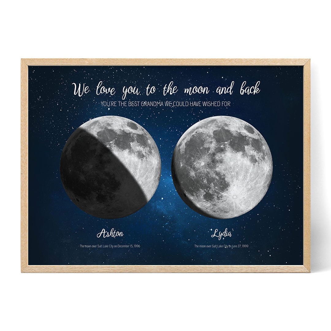 Op zoek naar een uniek en betekenisvol cadeau voor oma? Two Moons for Grandma is een attent en persoonlijk cadeau dat haar hart zal doen smelten. Deze prachtige print of canvas toont de maanstanden van twee belangrijke data, zoals de geboortedata van haar kleinkinderen. Het is een perfecte manier om de speciale band die ze met haar familie deelt te vieren.