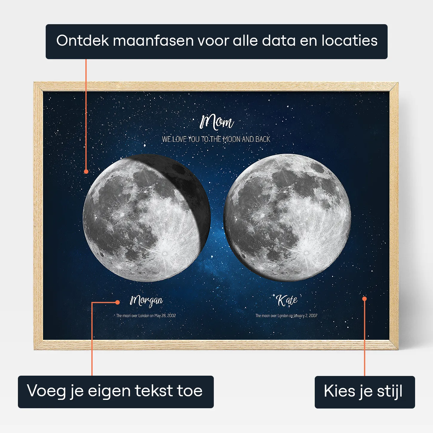 Op zoek naar een speciaal cadeau voor mama? Two Moons for Mom is een hartverwarmend en uniek cadeau dat haar zal doen glimlachen. Deze gepersonaliseerde print of canvas toont de maanstanden van twee belangrijke data, zoals de geboortedata van haar kinderen. Het is een prachtige manier om deze kostbare momenten vast te leggen en haar te herinneren aan de speciale band die ze met haar kinderen deelt.