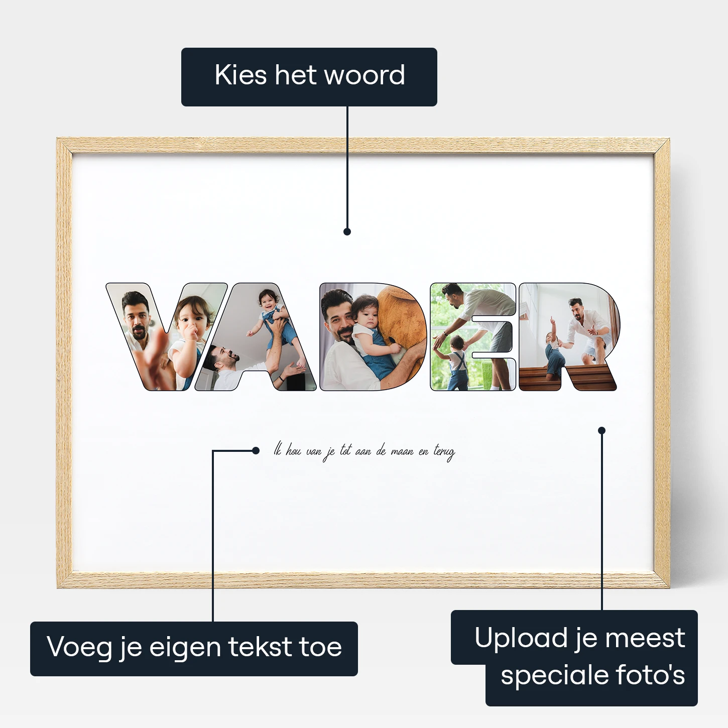 Om je eigen vaderbrief fotocollage te maken ga je naar onze online editor en upload je je favoriete foto's. Elke letter van het gekozen woord wordt gemaakt van de door jou gekozen foto's, waardoor een uniek kunstwerk ontstaat. Je kunt kiezen uit verschillende afdrukformaten, waaronder posters, afdrukken op canvas of ingelijst, of digitale downloadbestanden om zelf af te drukken.