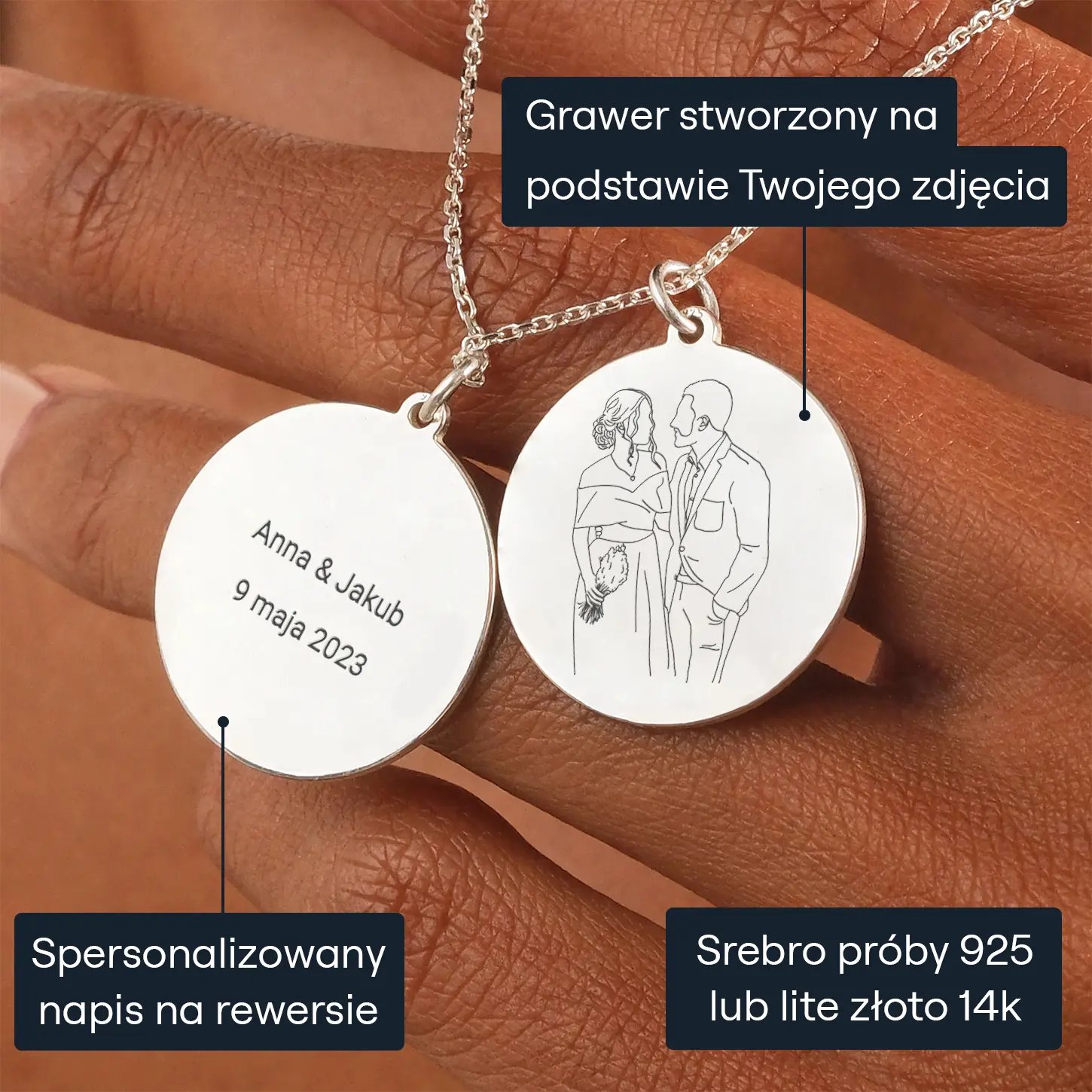 Dzięki naszej Biżuterii Line Art na Rocznicę, każdy wisiorek jest wyjątkowy. Nasi utalentowani artyści ręcznie rysują każdy projekt na podstawie Twojego zdjęcia, tworząc piękne, minimalistyczne ilustracje. Na odwrocie możesz dodać personalizowaną wiadomość, taką jak data ślubu lub osobistą notatkę, na przykład "Na zawsze Twój."