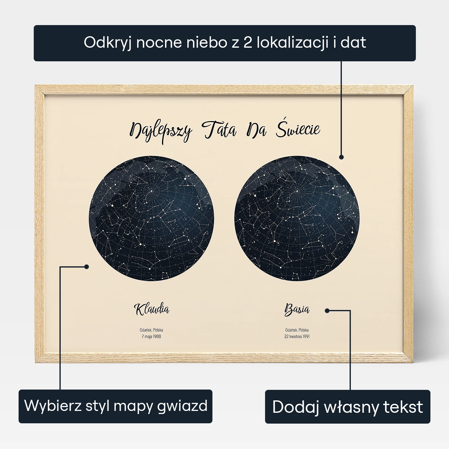 "Dni, w Których Zostałeś Naszym Tatą" to spersonalizowany prezent idealny dla ojców, którzy cenią sobie wyjątkowe chwile bycia rodzicem. Ten wyjątkowy i przemyślany prezent przedstawia nocne niebo w dniu, w którym ojciec powitał na świecie każde ze swoich dzieci, tworząc piękne odzwierciedlenie wszechświata w każdej wyjątkowej chwili.
