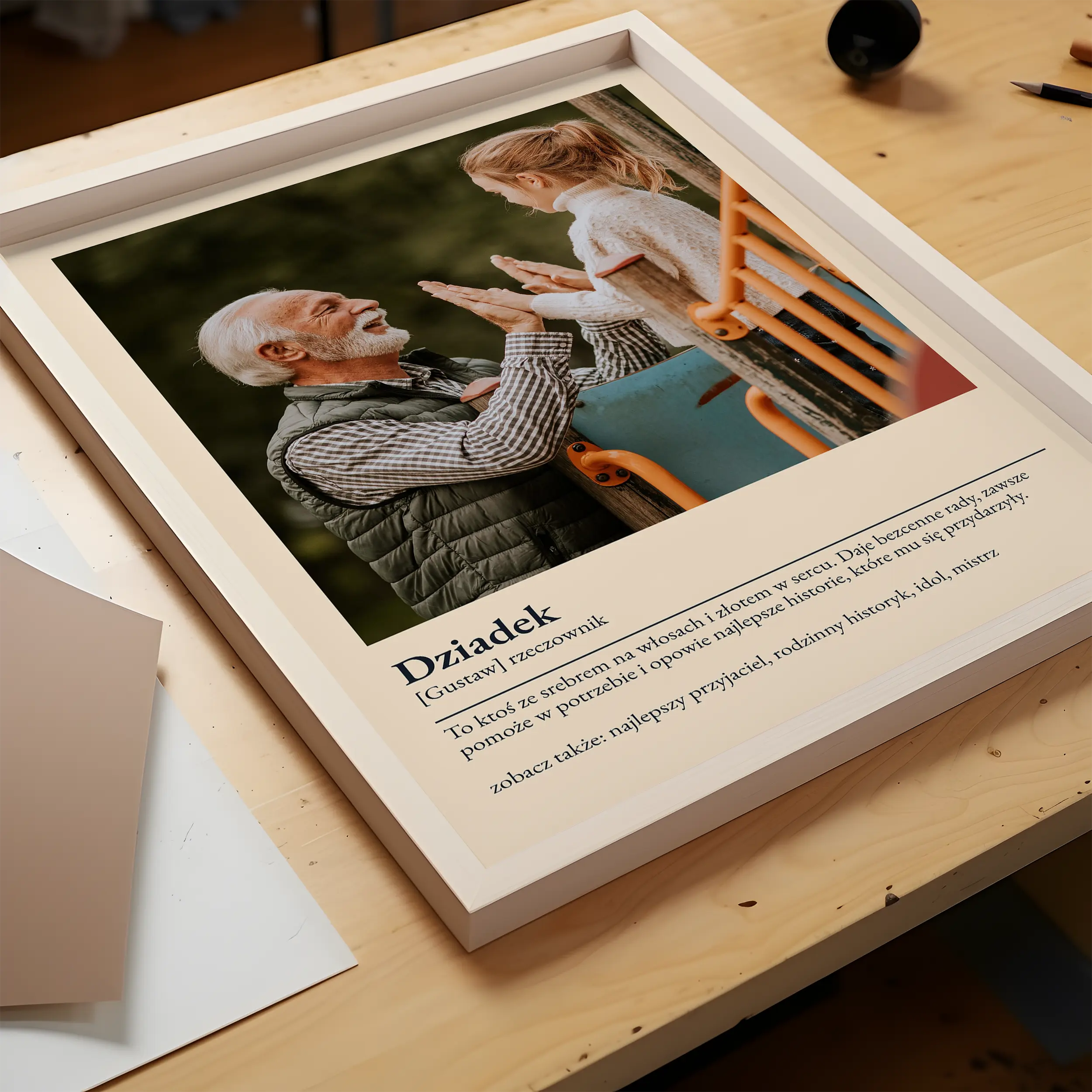 Uhonoruj wyjątkową więź, którą dzielisz ze swoim dziadkiem dzięki naszemu produktowi Dziadek Plakat z Definicją. Ten personalizowany wydruk łączy w sobie cenne zdjęcie ze słownikową definicją "dziadka" lub innego słowa, które uosabia jego istotę. Niezależnie od tego, czy wybierzesz definicję, która jest humorystyczna, czy głęboko sentymentalna, ten prezent z pewnością rozgrzeje jego serce.