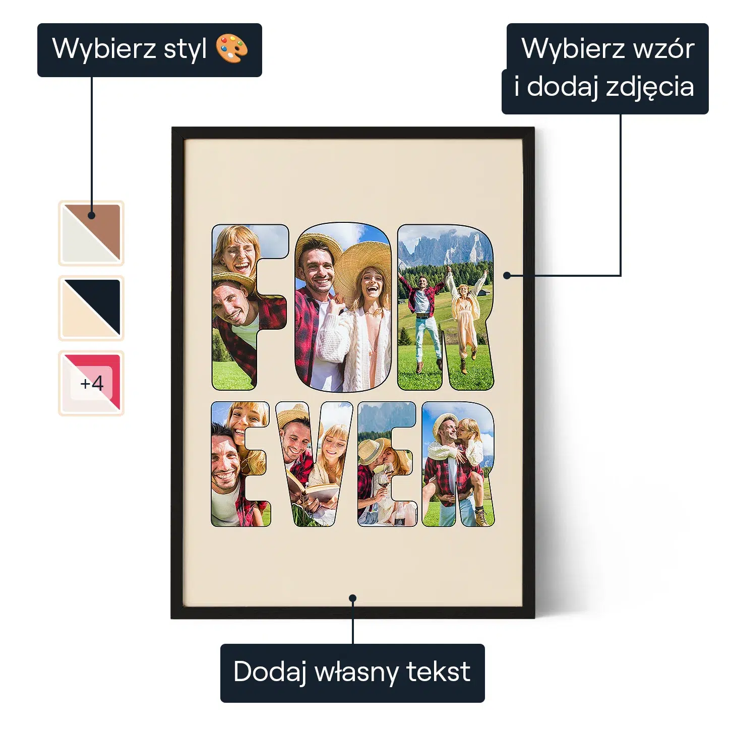 Oferujemy bezpłatną personalizację dla wszystkich zamówień, zapewniając, że każde dzieło sztuki jest unikalnie dostosowane do preferencji naszych klientów. Nasz przyjazny dla użytkownika interfejs umożliwia łatwe tworzenie własnych, personalizowanych dzieł sztuki. Niezależnie od tego, czy korzystasz z komputera stacjonarnego, czy urządzenia mobilnego, nasz interfejs został zaprojektowany z myślą o intuicyjnym doświadczeniu.