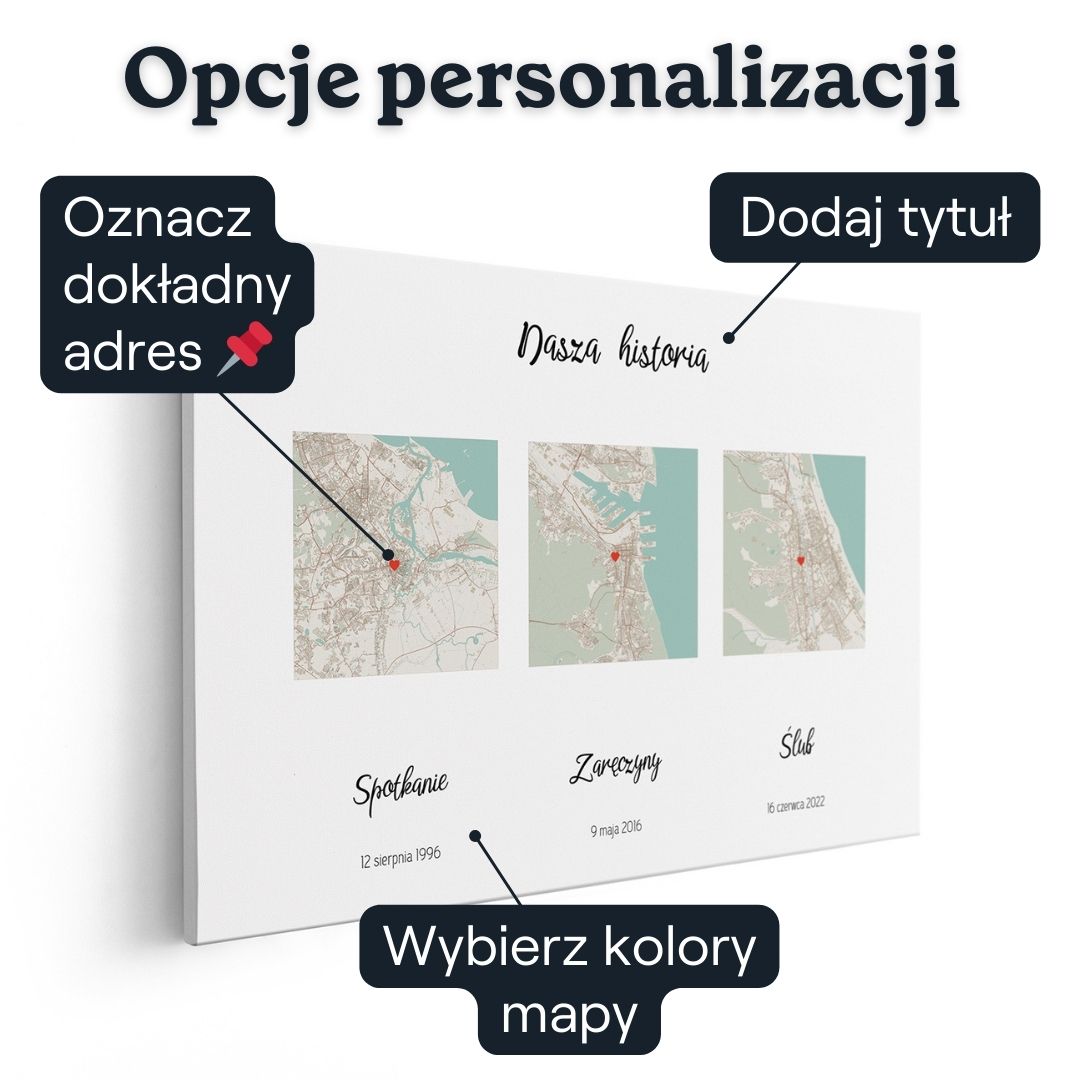 Szukasz wyjątkowego i wartościowego prezentu ślubnego? Nasz Obraz na Płótnie Historia Naszej Miłości to idealny wybór. To personalizowane płótno zawiera trzy mapy, z których każda podkreśla ważny moment w związku pary: gdzie się poznali, zaręczyli i pobrali.