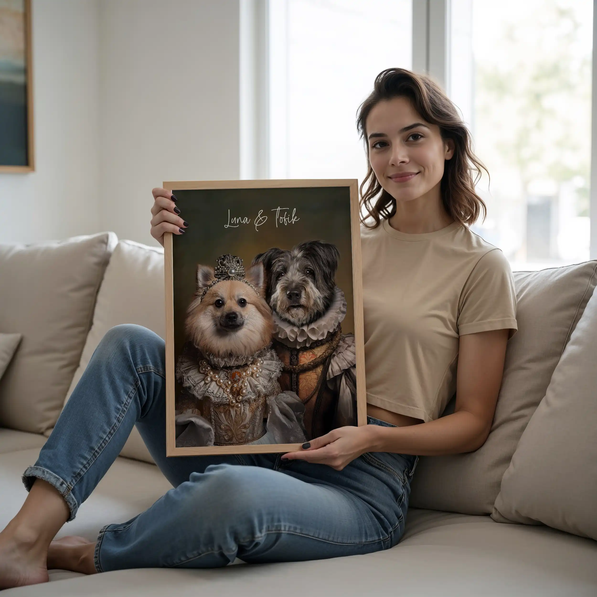 Uwiecznij swoje dwa psiaki w królewskich strojach na wyjątkowym, personalizowanym portrecie. Pełna elegancji oprawa, dopracowane detale i odrobina humoru sprawią, że Twój duet będzie wyglądał jak prawdziwa para z królewskiego dworu