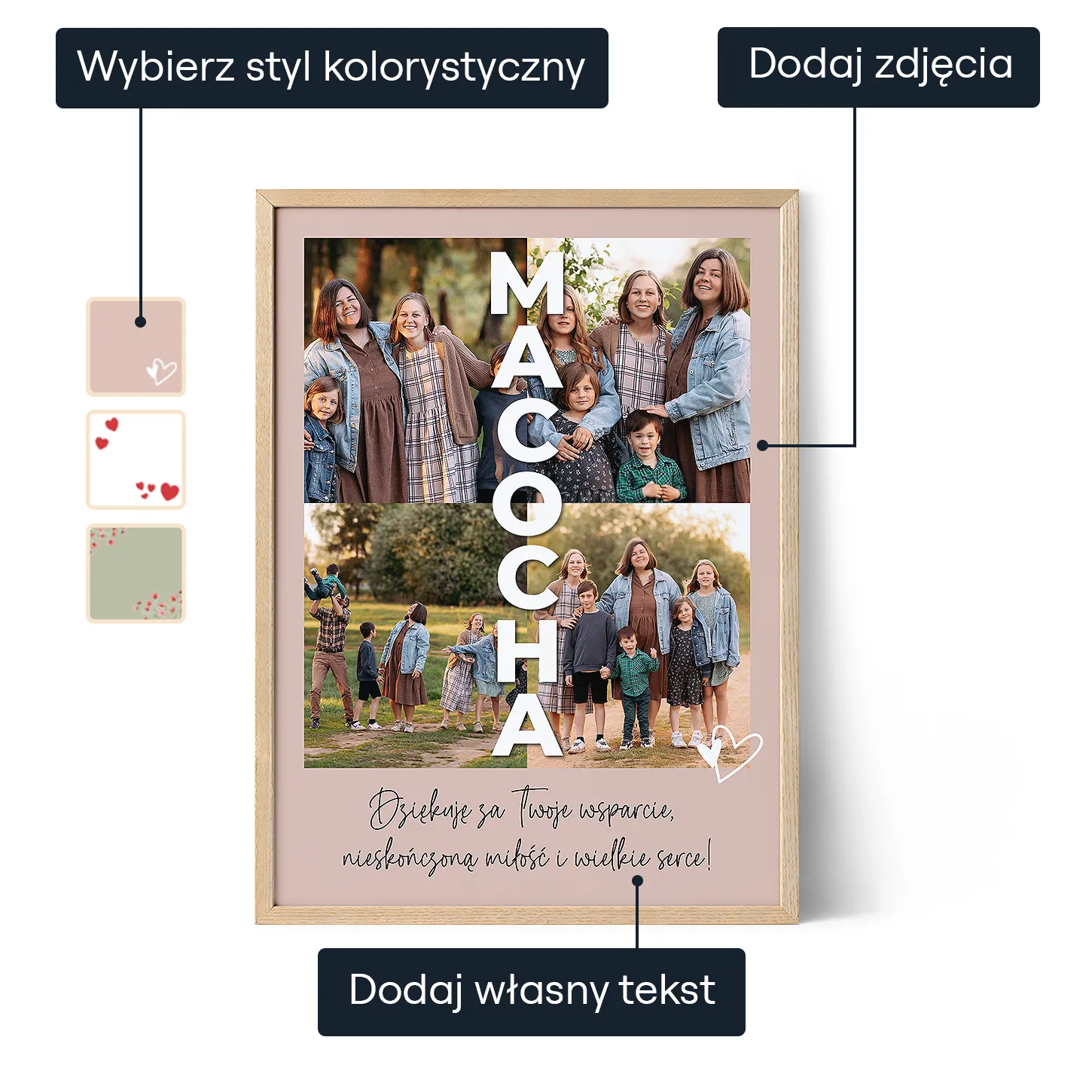 Oferujemy bezpłatną personalizację dla wszystkich zamówień, zapewniając, że każde dzieło sztuki jest unikalnie dostosowane do preferencji naszych klientów. Nasz przyjazny dla użytkownika interfejs umożliwia łatwe tworzenie własnych, personalizowanych dzieł sztuki. Niezależnie od tego, czy korzystasz z komputera stacjonarnego, czy urządzenia mobilnego, nasz interfejs został zaprojektowany z myślą o intuicyjnym doświadczeniu.